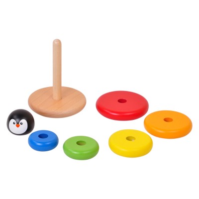 Με αυτό τον ξύλινο πιγκουίνο πυραμίδα, το παιδί μπορεί να φτιάξει δικούς τους συνδυασμούς από πολύχρωμες ροδέλες και μπορεί να μάθει τα διαφορετικά μεγέθη.