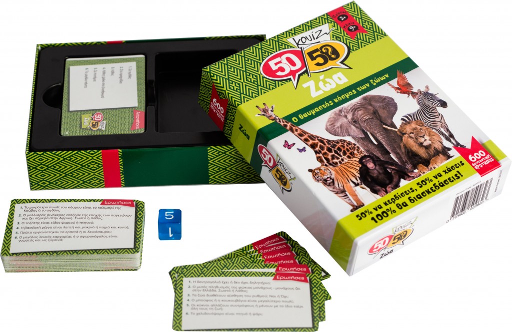 Μάθε τα πάντα για το ζωικό βασίλειο! Τέσταρε τις γνώσεις σου και συναγωνίσου τους φίλους σου με το νέο επιτραπέζιο ερωτήσεων 50-50 Κουίζ Ζώα! Με 600 ερωτήσεις που καλύπτουν ποικίλα θέματα, μαθαίνεις τις πιο ενδιαφέρουσες και αξιοπερίεργες πληροφορίες.