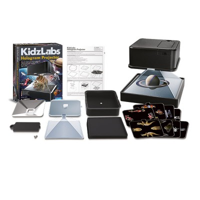 ΤΡΟΠΟΣ ΛΕΙΤΟΥΡΓΙΑΣ: Η μπαταρία δίνει ενέργεια στο φωτάκι LED της βάσης και αυτό φωτίζει προς τα πάνω για να ρίξει φως στη διαφάνεια. Το φως από τη διαφάνεια φωτίζει προς τα πάνω προς την τετράπλευρη οθόνη. Παρόλο που η τετράπλευρη οθόνη είναι διαφανής, λειτουργεί σαν καθρέφτης. Αντανακλάται κάποιο μέρος του φωτός από τη διαφάνεια. Το φως βγαίνει από τη διαφάνεια και η οθόνη αντανακλά ένα μέρος αυτού μέσα από μία γωνία έτσι ώστε το φως να βγαίνει από τα πλάγια. Όταν βλέπετε την οθόνη από τα πλάγια, μπορείτε να δείτε μέσα της μέχρι και την άλλη πλευρά, αλλά μπορείτε επίσης να δείτε και το αντανακλώμενο φως από την οθόνη. Αυτό κάνει το αντικείμενο να φαίνεται σαν να αιωρείται, όπως ένα ολόγραμμα. Όταν βλέπετε τις διαφορετικές πλευρές της οθόνης, βλέπετε εικόνες διαφορετικών πλευρών του αντικειμένου. Αυτό δίνει την εντύπωση ότι η αιωρούμενη εικόνα είναι τρισδιάστατη.