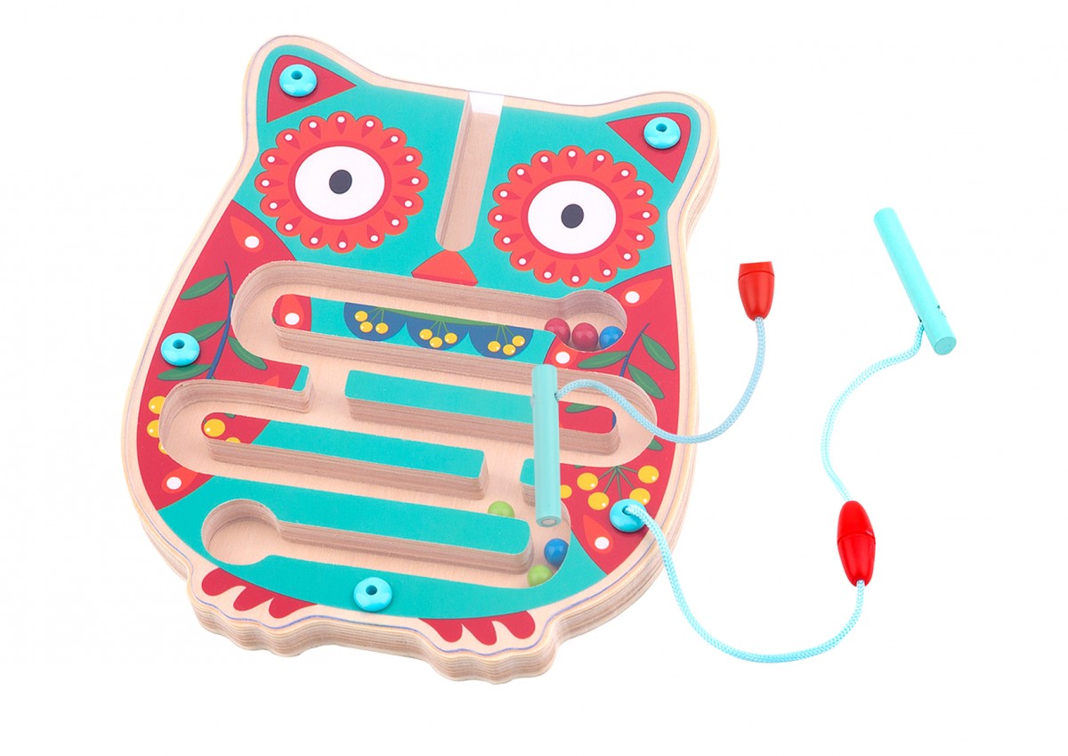 Ποιο αγαπημένο ζωάκι των παιδιών κάνει κουκουβάου κουκουβάου; Στον λαβύρινθο της κουκουβάγιας μετακίνησε τις μικρές μπάλες στους διαδρόμους του λαβυρίνθου με το μαγνητικό ξυλάκι και ολοκλήρωσε τη διαδρομή χωρίς να χαθείς! Ο ξύλινος λαβύρινθος σε σχήμα κουκουβάγιας βοηθάει στη βελτίωση των κινητικών ικανοτήτων και στο συντονισμό χεριού - ματιού κι είναι η ιδανική ιδέα για δώράκι. Κατάλληλο για παιδιά ηλικίας από 18 μηνών και άνω. Οι μπάλες είναι προστατευμένες με πλεξιγκλάς και δεν αποσπώνται.