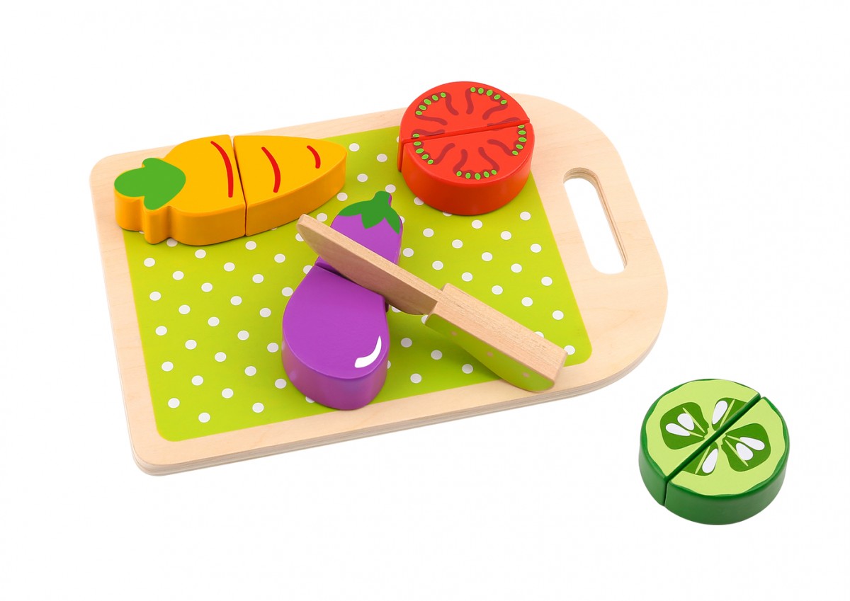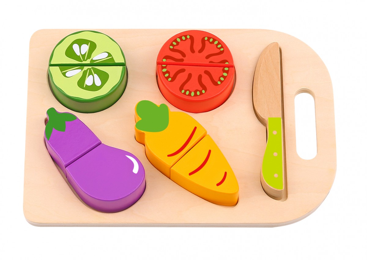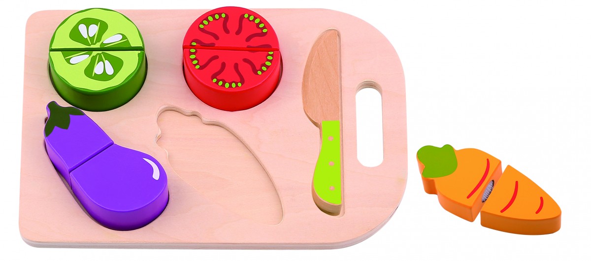 Τα ξύλινα σφηνώματα λαχανικών βοηθούν το παιδί να εξοικειωθεί με τα λαχανικά, τα σχήματα και τα χρώματα. Χρησιμοποιώντας ένα ξύλο κοπής και ένα ξύλινο μαχαιράκι, μπορεί εύκολα και γρήγορα να κόψει τα λαχανικά μαθαίνοντας την έννοια του μισού και του ολόκληρου. Συμπεριλαμβάνεται το ξύλο κοπής, το ξύλινο μαχαιράκι κι ο δίσκος για την τοποθέτηση των λαχανικών. Κατάλληλο για παιδιά ηλικίας άνω των 12 μηνών.