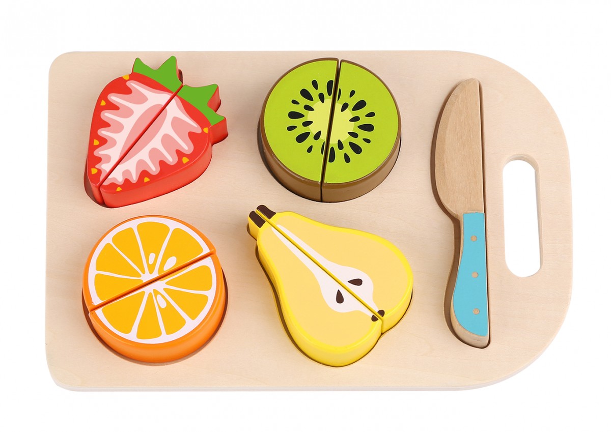 Ο μικρός μας σεφ θα δημιουργήσει γευστικά πιάτα από φρούτα. Χρησιμοποιώντας ένα ξύλο κοπής και ένα ξύλινο μαχαιράκι, μπορεί εύκολα και γρήγορα να κόψει πορτοκάλια, φράουλες, αχλάδια και ακτινίδια και να τα προσφέρει σους φίλους του, μαθαίνοντας έτσι την έννοια του μισού και του ολόκληρου! Έτσι, η μάθηση γίνεται παιχνίδι! Κατάλληλο για παιδιά ηλικίας άνω των 12 μηνών.
