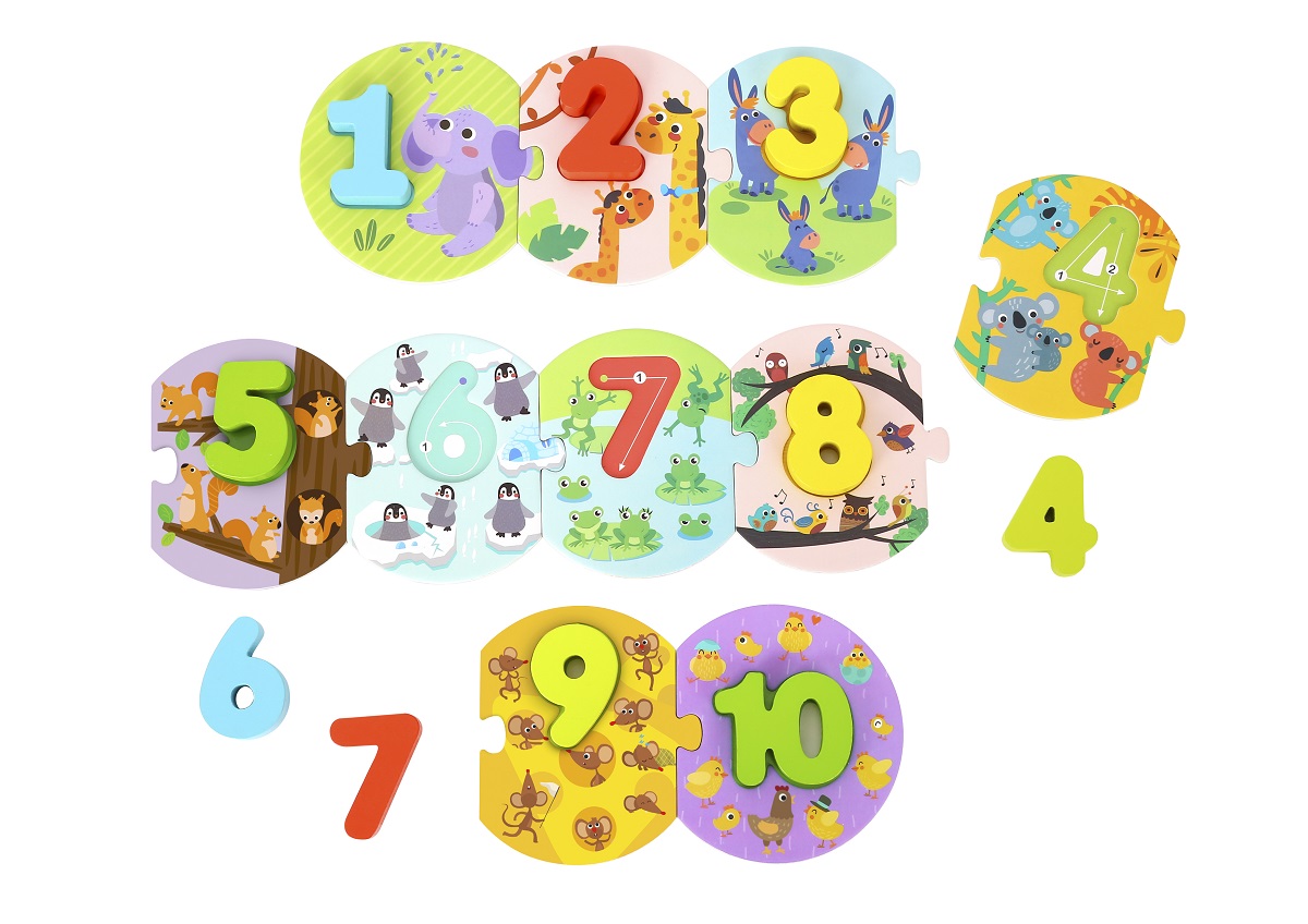 Το παιχνίδι αποτελείται αφενός από 10 στρογγυλά κομμάτια παζλ που απεικονίζουν τον αριθμό και την ποσότητά του μέσα από παιδική εικονογράφηση ζώων και αφετέρου από αριθμούς από το 1 έως το 10 με ωραία χρώματα. Επίσης, επάνω στα κομμάτια του παζλ είναι σχεδιασμένος ο αριθμός με βελάκια για κατευθύνουν το παιδί να σχηματίσει τον αριθμό και να μάθει τον τρόπο γραφής του.