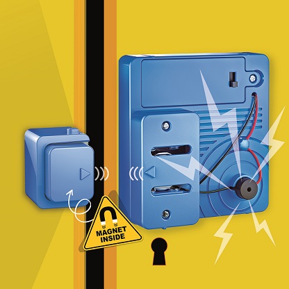 Όταν η πόρτα είναι κλειστή και τα τρίγωνα στην υποδοχή του μαγνήτη και τη βάση ευθυγραμμίζονται, ο δίσκος έλκεται από τον μαγνήτη στη μία πλευρά της περιοχής με τις τρύπες. Όταν ανοίξει η πόρτα, ο μαγνήτης απομακρύνεται από τη βάση και η έλξη από τον μαγνήτη δεν είναι πλέον αρκετά ισχυρή για να συγκρατήσει τον δίσκο. Ο δίσκος κυλά προς τα κάτω, στο κάτω μέρος της περιοχής των τρυπών, και παραμένει ανάμεσα στις δύο πλάκες με τις τρύπες. Αυτό λειτουργεί σαν διακόπτης, συμπληρώνοντας το κύκλωμα και επιτρέποντας τη ροή ρεύματος μέσω του βομβητή.