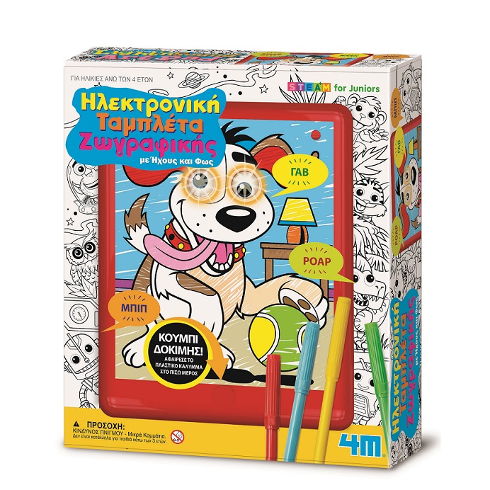 ΠΕΡΙΕΧΟΜΕΝΑ: Ηλεκτρονική ταμπλέτα ζωγραφικής με ήχους και φως (περιλαμβάνει 2x1,5V μπαταρίες κουμπί τύπου AG13/LR44), βιβλιαράκι ζωγραφικής 16 σελίδων, 4 x μαρκαδόρους και λεπτομερείς οδηγίες.