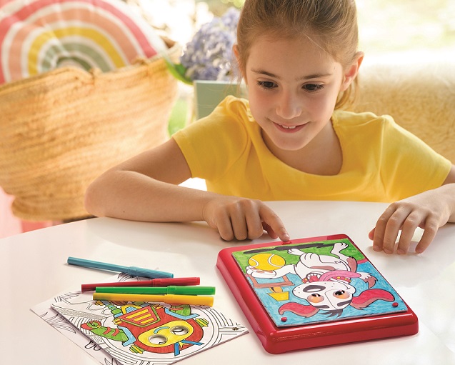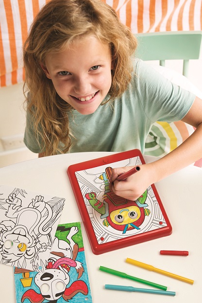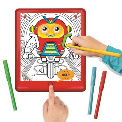 Χρωμάτισε τις εικόνες με τους μαρκαδόρους της συσκευασίας ή τους δικούς σου για να κάνεις το σχέδιό σου πολύχρωμο. Στη συνέχεια, τοποθέτησε τη ζωγραφιά σου στις τρύπες της ταμπλέτας, πίεσε το κουμπί και δες τα μάτια να φωτίζονται με διαφορετικά ηχητικά εφέ!