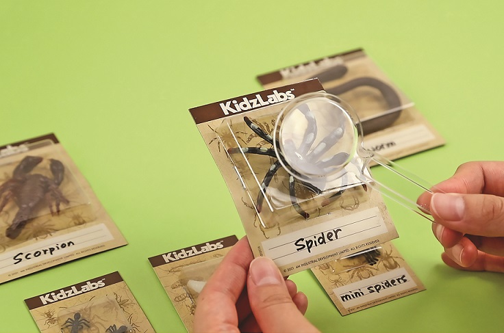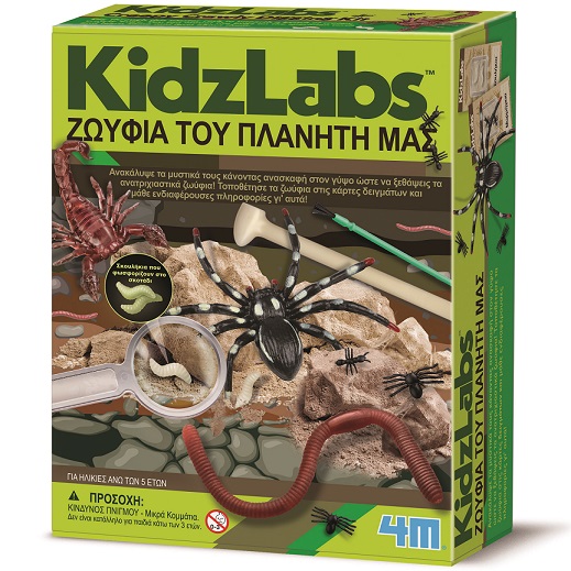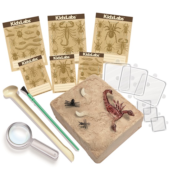 Κομμάτι γύψου με ανατριχιαστικά ζωύφια (αράχνη, σκορπιός, γεωσκώληκας, μυρμήγκια, μικρές αράχνες, σκουλήκια που λάμπουν στο σκοτάδι), εργαλείο ανασκαφής, πινέλο, μικρές και μεγάλες κάρτες δειγμάτων, ειδικές θήκες, μεγεθυντικός φακός και λεπτομερείς οδηγίες.