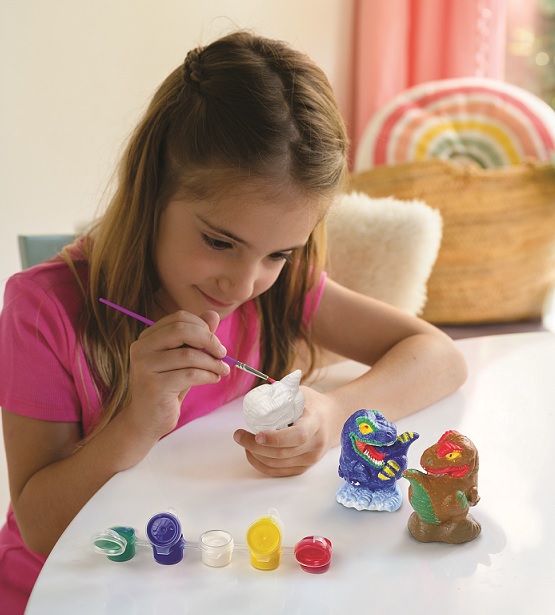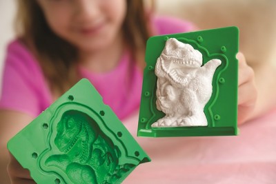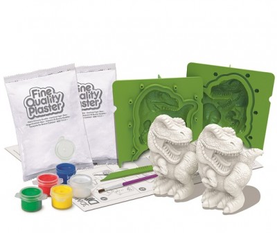 Προετοίμασε τον γύψο ακολουθώντας τις οδηγίες και ρίξε το μείγμα στο καλούπι. Περίμενε λίγο μέχρι να σταθεροποιηθεί και έπειτα αφαίρεσέ τον και αφού στεγνώσει εντελώς, ζωγράφισε τον τρισδιάστατο Τυραννόσαυρο Ρεξ με τα παρεχόμενα χρώματα.