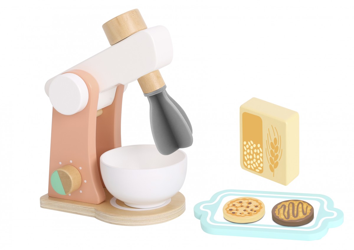 Το σετ αποτελείται από 6 ξύλινα τεμάχια: ένα μίξερ σε όμορφα χρώματα, ένα μπολ, ένας δίσκος σερβιρίσματος, ένα βούτυρο και δύο μπισκοτάκια.