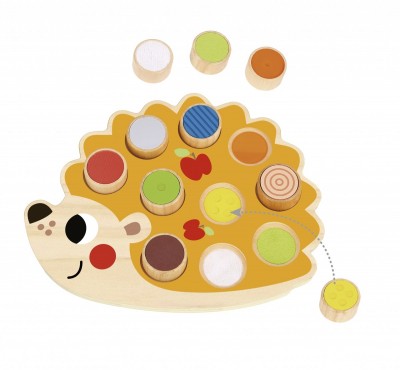 Ένα ιδιαίτερο και πρωτότυπο παιχνίδι με διαφορετικά σφηνώματα σε σχήμα σκατζόχοιρου! Το παιχνίδι αποτελείται από 11 τεμάχια και πιο συγκεκριμένα έναν μεγάλο ξύλινο σκαντζόχοιρο και 10 διαφορετικά σφηνώματα. Ο ξύλινος σκαντζόχοιρος έχει στην πλάτη του υποδοχές με διαφορετικά χρώματα και υφές. Κάθε σφήνωμα αντιστοιχεί σε μία υποδοχή με βάση το χρώμα ή την υφή του σφηνώματος.