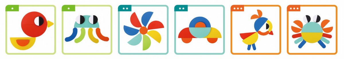 Με αυτό το παιχνίδι τα παιδιά προσπαθούν να ταιριάξουν τα σχήματα μεταξύ τους αναπαράγωντας την εικόνα της κάρτας. Με αυτόν τον τρόπο, τα παιδιά αναπτύσσουν τη δεξιότητα επίλυσης προβλημάτων και τις βασικές μαθηματικές δεξιότητές τους. Επιπλέον, είναι ένα παιχνίδι που καλλιεργεί τη γνωστική ανάπτυξη του παιδιού και διεγείρει την κριτική σκέψη μέσω της απεικονιστικής μνήμης.