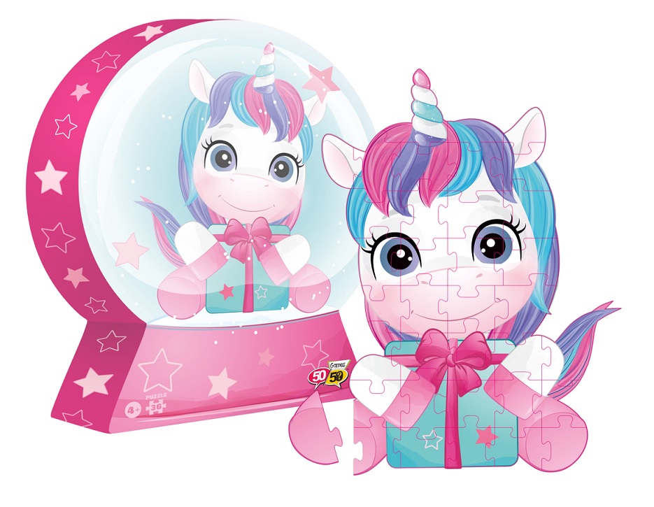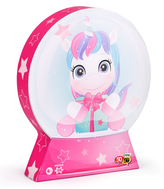 Ένα πρωτότυπο παζλ του οποίου το κουτί έχει σχήμα χιονόμπαλας και απεικονίζει έναν μικρό και χαμογελαστό μονόκερο να κρατάει ένα δώρο. Το παζλ 36 κομματιών απεικονίζει έναν πολύχρωμο μονόκερο και ανήκει στη σειρά «50/50 GAMES». Επίσης, το παζλ βελτιώνει την παρατηρητικότητα και τις μνημονικές ικανότητες των παιδιών, βοηθά τον συντονισμό xεριών και ματιών, την αναγνώριση σxημάτων και τις κινητικές ικανότητες των παιδιών.