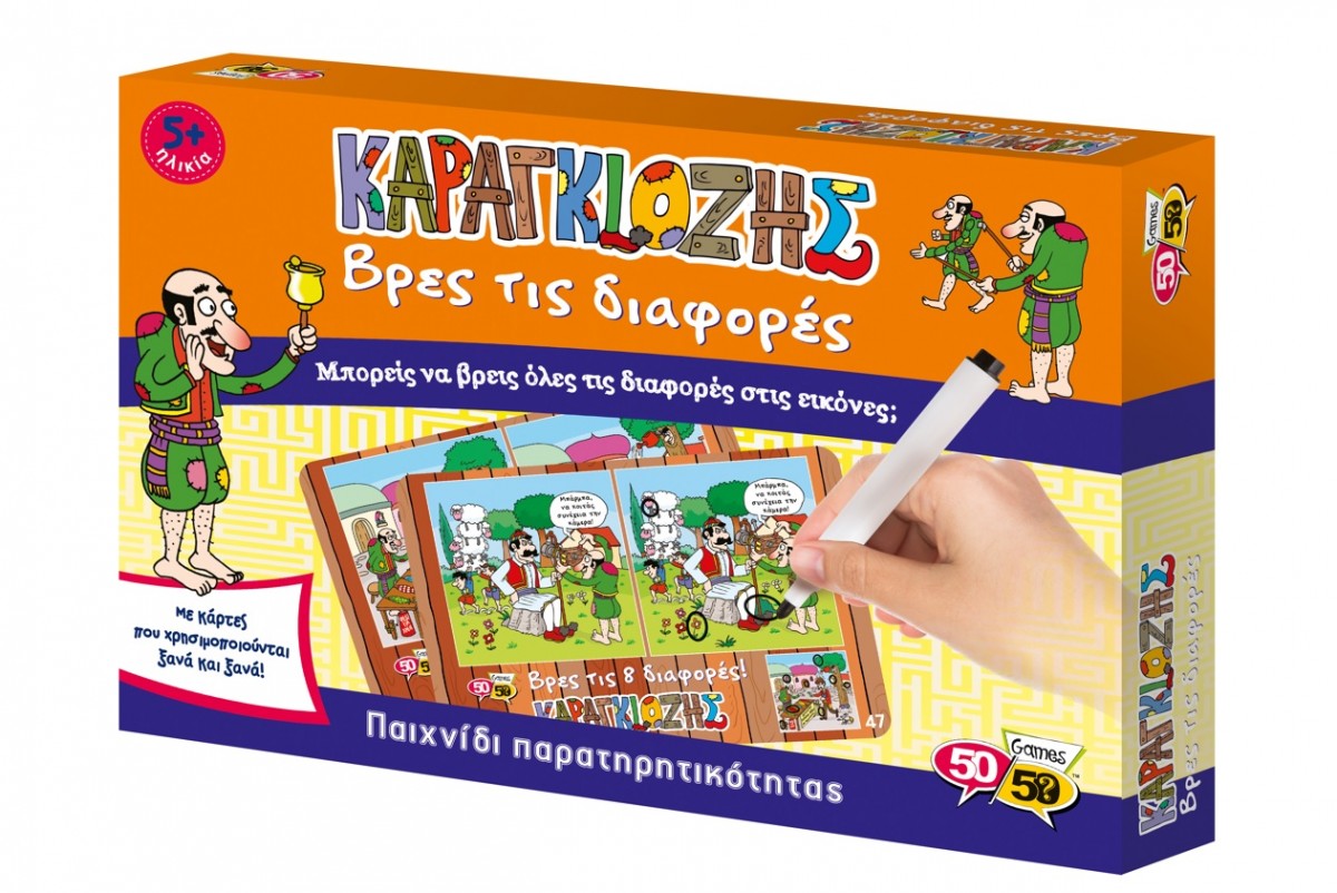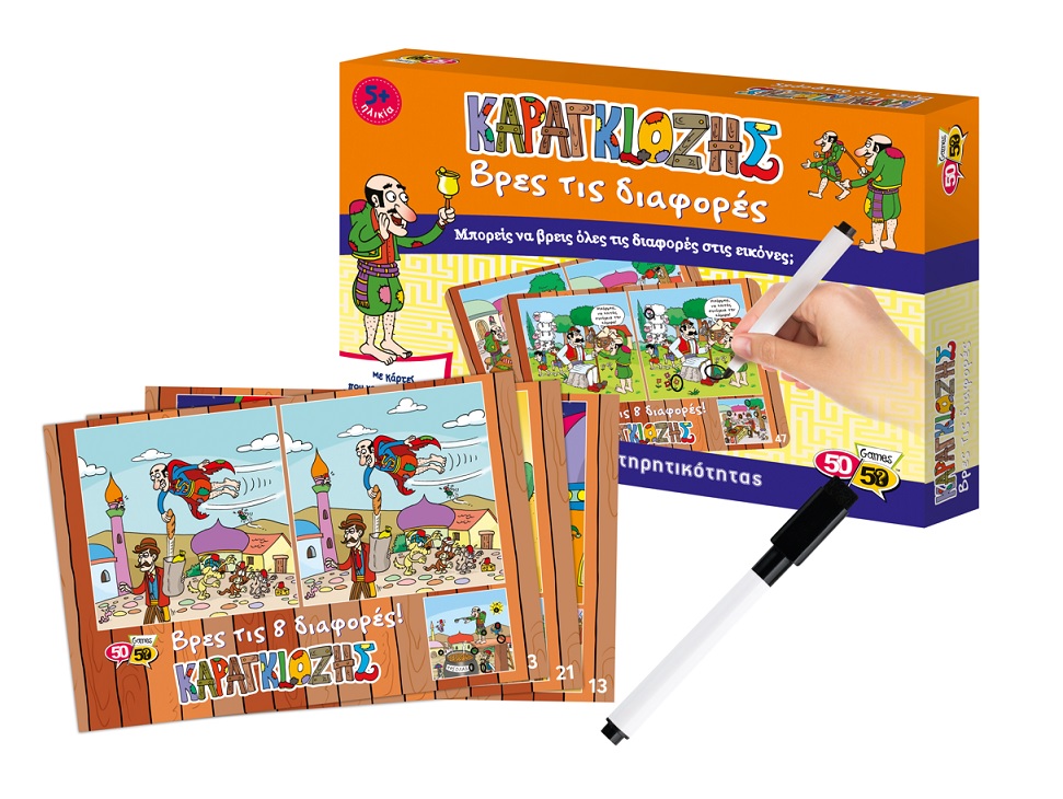 Πώς παίζεται: Προσπάθησε να βρεις τις διαφορές που υπάρχουν σε κάθε κάρτα και βάλ’τες σε κύκλο χρησιμοποιώντας τον μαρκαδόρο της συσκευασίας ή οποιονδήποτε άλλο μαρκαδόρο που σβήνει. Κάθε κάρτα έχει διαφορετικό αριθμό διαφορών διαβαθμισμένης δυσκολίας. Το παιχνίδι μπορεί να παιχτεί ξανά και ξανά από έναν παίκτη/ομάδα ή εναλλάξ από 2 ή περισσότερους παίκτες/ομάδες με ή χωρίς χρόνο.