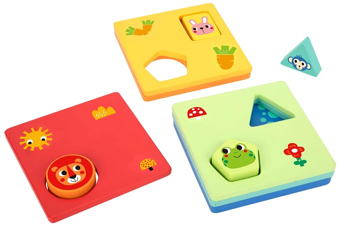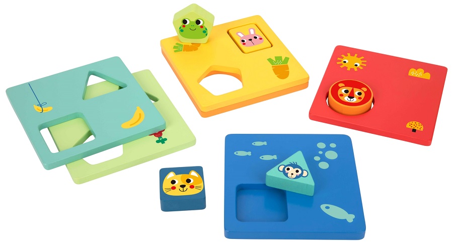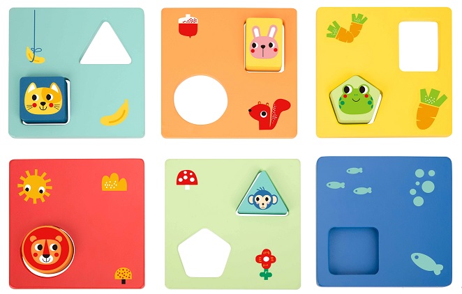 Το παιδί προσπαθεί να ταιριάξει τα σχήματα με τις αντίστοιχες οπές των ξύλινων πλακών – παζλ αλλά παράλληλα μπορεί να τις στοιβάξει μεταξύ τους ανά σχήμα και να προσπαθήσει να τοποθετήσει ξανά τα σχήματα στις αντίστοιχες οπές.