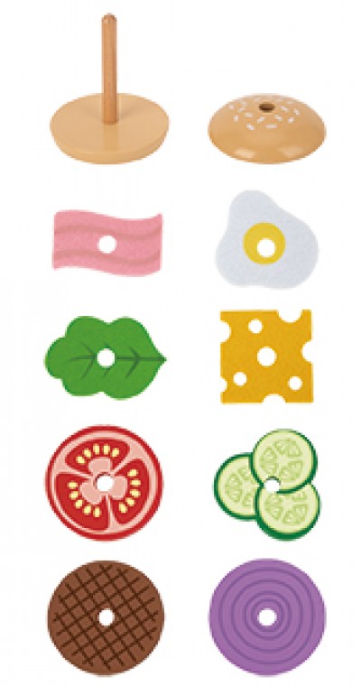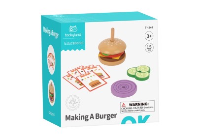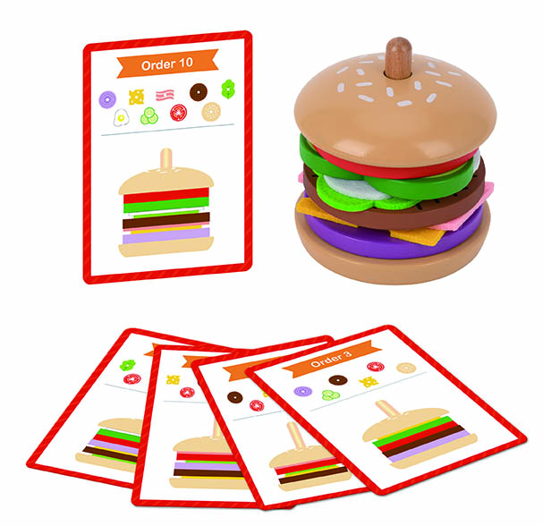 Το ξύλινο παιχνίδι μπέργκερ με κάρτες θα απασχολήσει δημιουργικά το παιδί, ενώ παράλληλα ενθαρρύνει την ανάπτυξη της οπτικής και συνδυαστικής αντίληψης, τις λεπτές κινητικές δεξιότητες και τον συντονισμό χεριού και ματιού. Επίσης, είναι μια μορφή παιχνιδιού που προσομοιώνει τις κοινωνικές σχέσεις και τις λειτουργίες της κοινωνίας, καθώς δίνεται η ευκαιρία στα παιδιά να πειραματιστούν με τη μαγειρική και να αλληλοεπιδράσουν με τους γύρω τους με αφορμή το φαγητό.