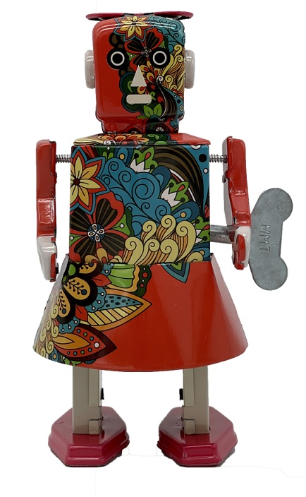 Ένα ιδιαίτερο χειροποίητο κουρδιστό μεταλλικό ρετρό ρομπότ εμπνευσμένο από τις δεκαετίες του ΄50 και του ΄60. Κατασκευασμένο από κασσίτερο, είναι χειροποίητο και αποτελείται από πολύχρωμα γραφικά σχεδιασμένα με κάθε λεπτομέρεια, αγάπη και μεράκι. Στην Ελλάδα ήταν δημοφιλή ως τσίγκινα παιχνίδια.