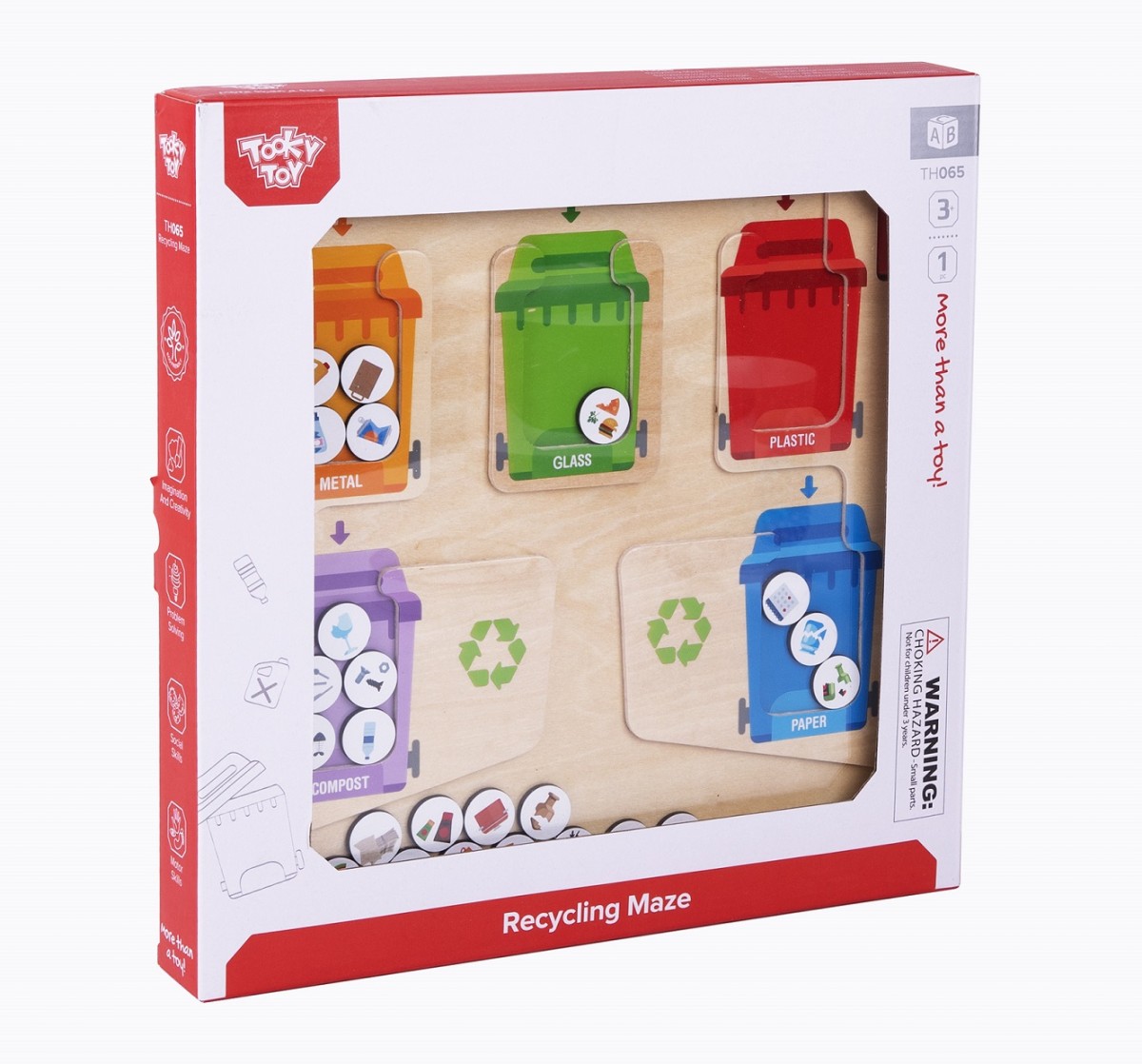 Κάθε κάδος ανακύκλωσης προσφέρει τη δυνατότητα εξάσκησης των λεπτών κινητικών δεξιοτήτων, της κριτικής και συνδυαστικής σκέψης. Το παιδί καλείται με το ενσωματωμένο στιλό μαγνήτη να μεταφέρει στον κάδο ανακύκλωσης τις κονκάρδες που αντιπροσωπεύουν αντικείμενα από διαφορετικές κατηγορίες, όπως πλαστικό, χαρτί, γυαλί, μέταλλο, κομπόστ.