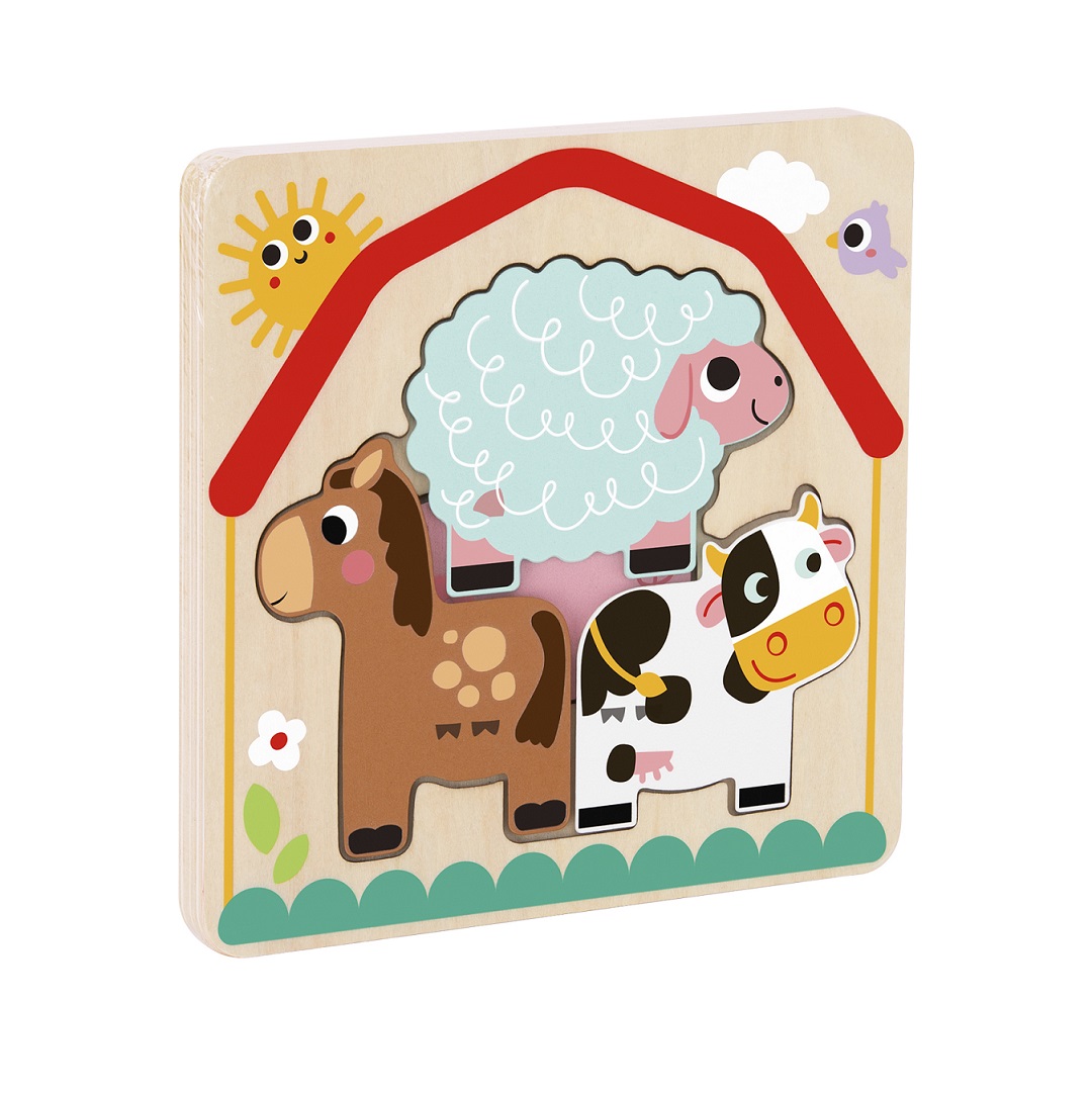 Τα κομμάτια του παζλ απεικονίζουν ζωάκια της φάρμας: ένα κουνελάκι, μια κότα, ένα γουρούνι, ένα άλογο, μια αγελάδα, ένα πρόβατο. Το σετ περιμβάνει μία βάση που διαθέτει εσοχές για να κατασκευάσουν τα παιδιά το παζλ ακολουθώντας το γραμμικό σχέδιο των ζώων.