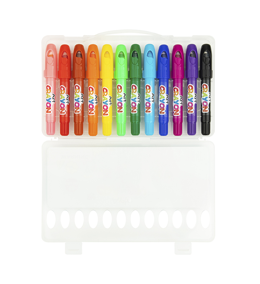 Κηρομπογιές σε σετ 12 χρωμάτων. Μη τοξικές και αφαιρούνται εύκολα από το δέρμα και τις επιφάνειες.