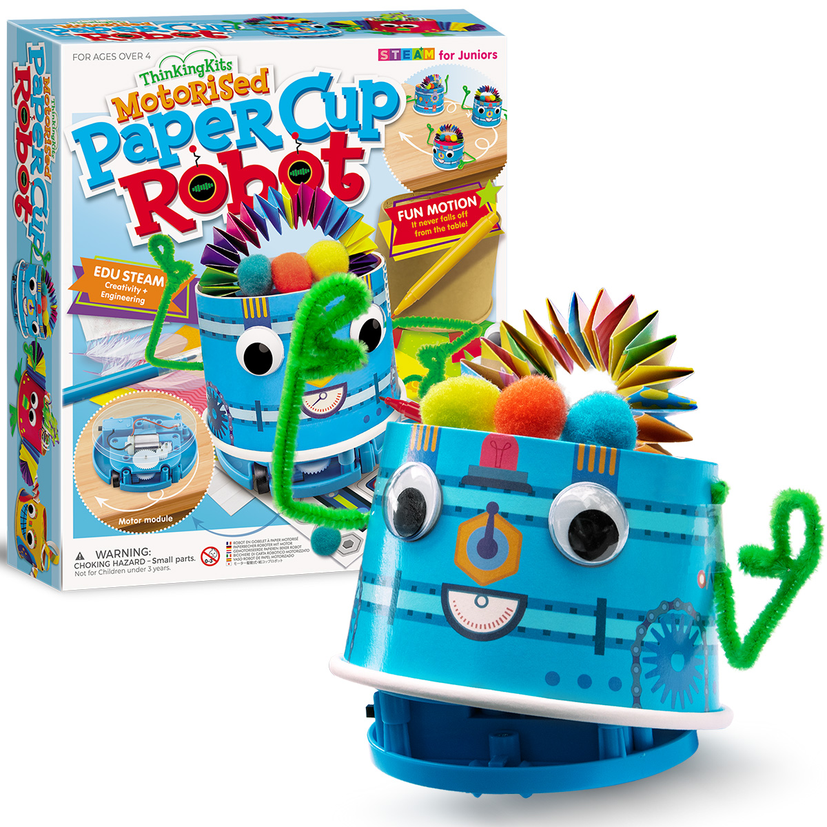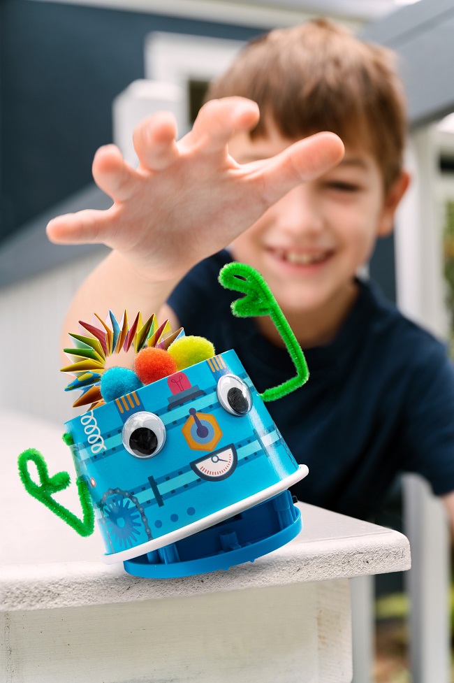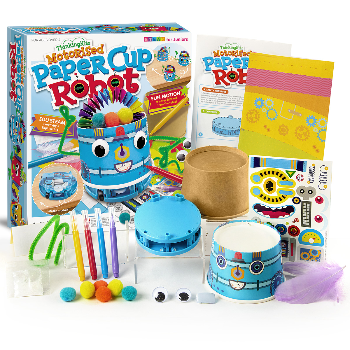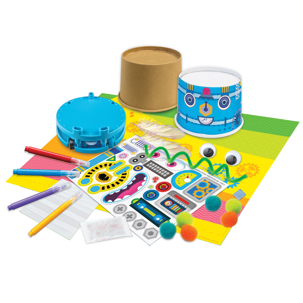 ΠΕΡΙΕΧΟΜΕΝΑ: (1) Βάση μοτέρ ρομπότ, (2) 2 Κύπελλα χαρτιού (1 απλό, 1 τυπωμένο), (3) 4 Μαρκαδόροι, (4) Αυτοκόλλητα, (5) Χαρτί με χρωματιστά μοτίβα, (6) 2 Φτερά, (7) 6 Πομ πομ, (8) 2 Κινούμενα μάτια, (9) Κολλητική ταινία διπλής όψης, (10) Γκλίτερ, (11) Σύρμα πίπας, (12) Κολλητική ταινία.