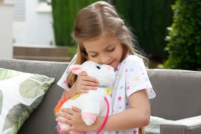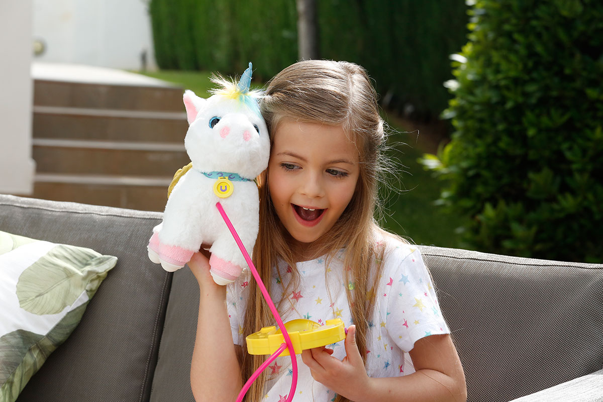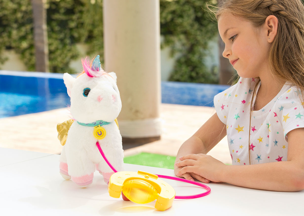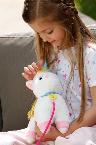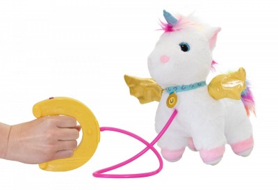 Ο πιο γρήγορος και χαριτωμένος μονόκερος που θα γίνει ο καλύτερός σου φίλος στις βόλτες. Είναι χνουδωτός και πολύ απαλός με λευκό χρώμα, απίθανα μαλακά φτερά και χρωματιστή ουρά. Διαθέτει λουράκι σε ροζ και κίτρινο χρώμα το οποίο πιέζοντάς το κουνάει τα φτερά και την ουρά του. Τα ειδικά ενσωματωμένα ροδάκια στις πατούσες του, του επιτρέπουν να κινείται σταθερά και γρήγορα. Παράγει μαγικούς ήχους ενός μονόκερου.