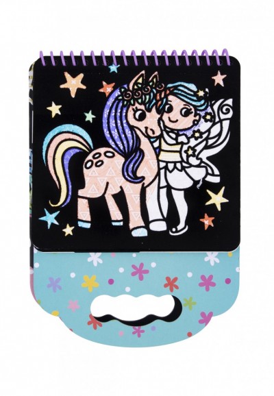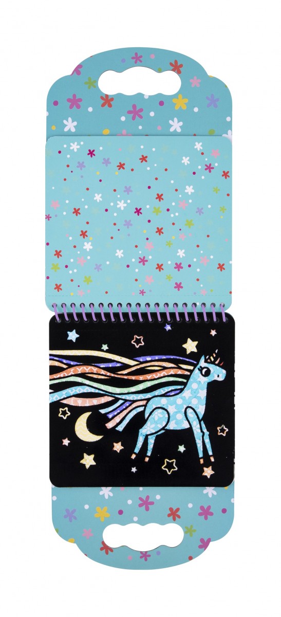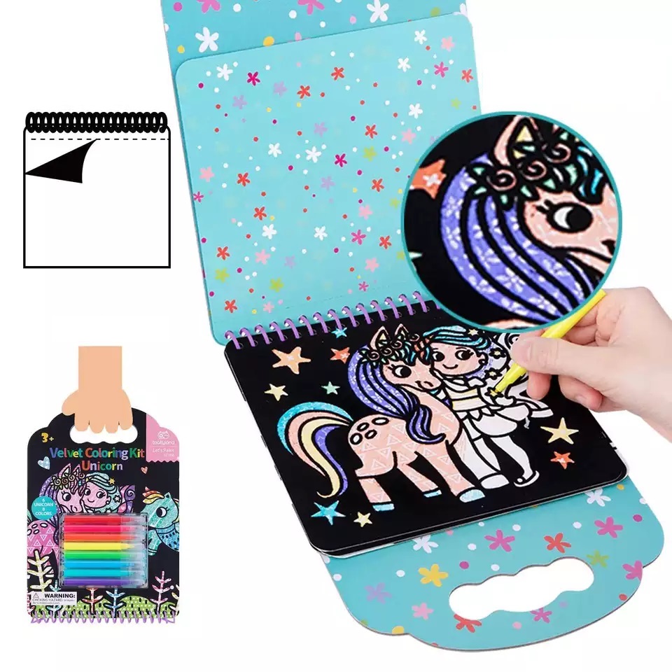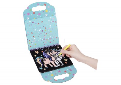 Το σετ ζωγραφικής σε βελούδο μονόκεροι θα ενθουσιάσει τους μικρούς καλλιτέχνες! Περιλαμβάνει 6 σελίδες για χρωματισμό με μονόκερους και 8 μαρκαδόρους σε διαφορετικά χρώματα. Οι σελίδες του σετ έχουν τρύπες στο πάνω μέρος τους, ώστε να μπορούν να κοπούν εύκολα. Έχουν βελούδινη υφή και όταν χρωματιστούν αποκαλύπτονται σχέδια ως δια μαγείας. Το σετ ζωγραφικής διαθέτει λαβή στο πάνω μέρος, έτσι ώστε να είναι εύκολο στη μεταφορά. Κατάλληλο για ηλικίες άνω των 3 ετών.