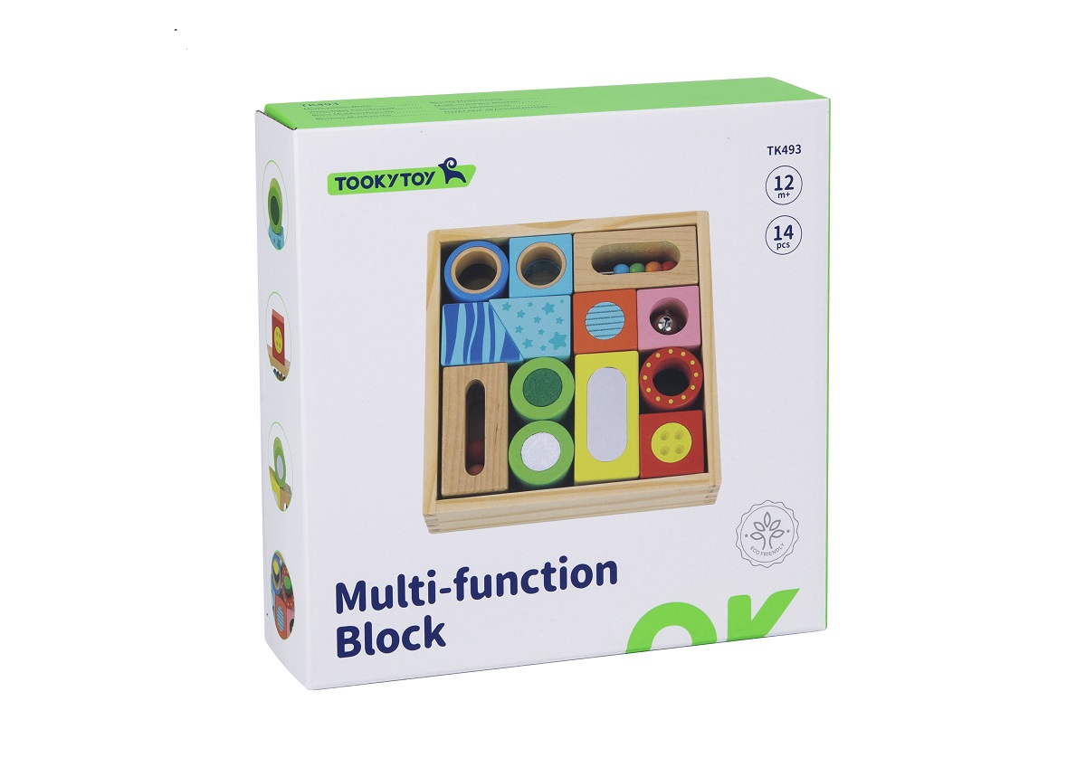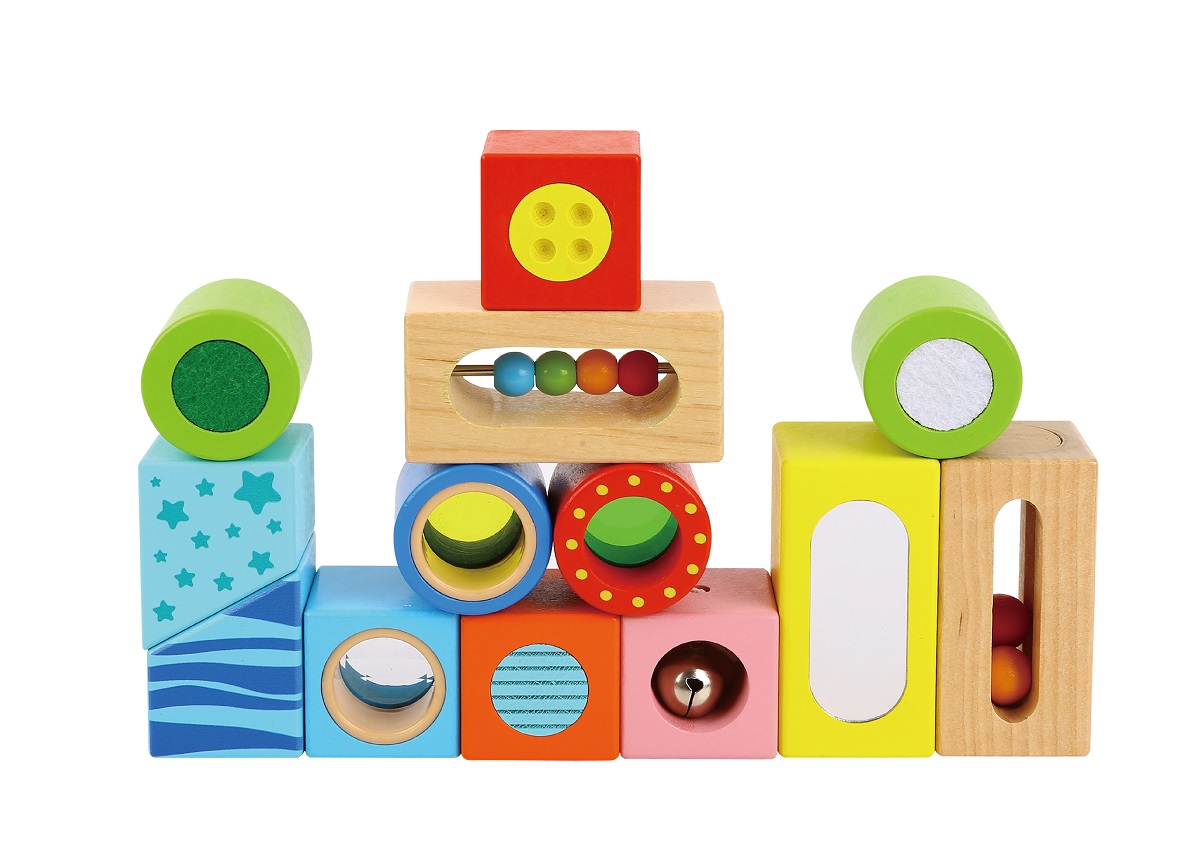Τα ξύλινα τουβλάκια πολλαπλών δραστηριοτήτων αποτελούνται από αθρεφτάκια, σχήματα, κουδουνάκια κ.α. προσφέροντας στο παιδί απεριόριστες επιλογές δημιουργικής απασχόλησης. Το παιχνίδι απευθύνεται σε παιδιά άνω των 12 μηνών. Αποτελείται από όμορφα, έντονα χρώματα που προσφέρουν ποικίλα οπτικά ερεθίσματα. Τα ξύλινα τουβλάκια πολλαπών δραστηριοτήτων βοηθούν στην ανάπτυξη ενός εύρους ικανοτήτων και δυνατοτήτων του παιδιού, όπως η αντίληψη, η ακουστική και κινητική ικανότητα, ο συντονισμός ματιού-χεριού, η οργανωμένη σκέψη και η φαντασία.