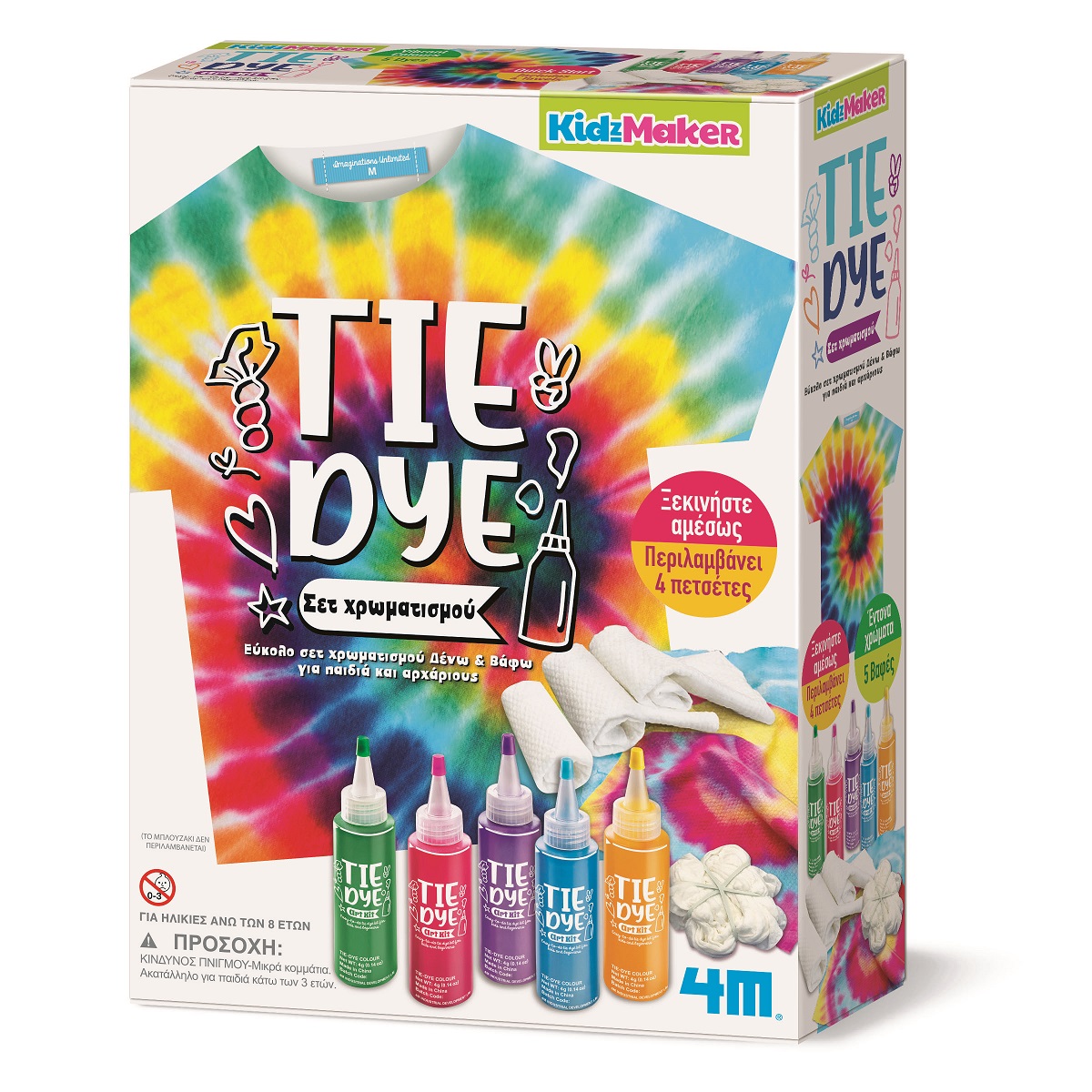 Δέσε το ύφασμα σε κόμπους ακολουθώντας τις οδηγίες και σταθεροποίησε το με τα λαστιχάκια. Χρωμάτισε με τις ειδικές βαφές που περιλαμβάνονται. Μόλις το ύφασμα στεγνώσει η Tie Dye δημιουργία σου είναι έτοιμη!