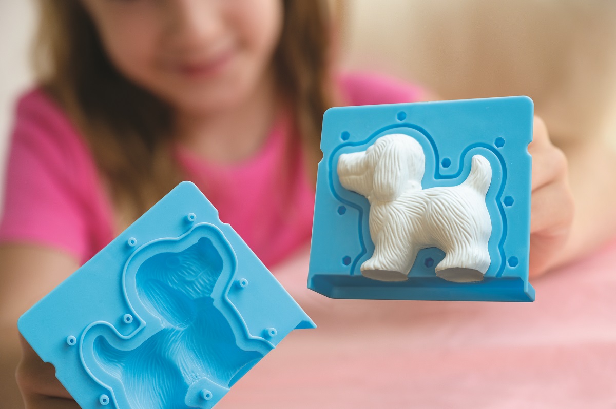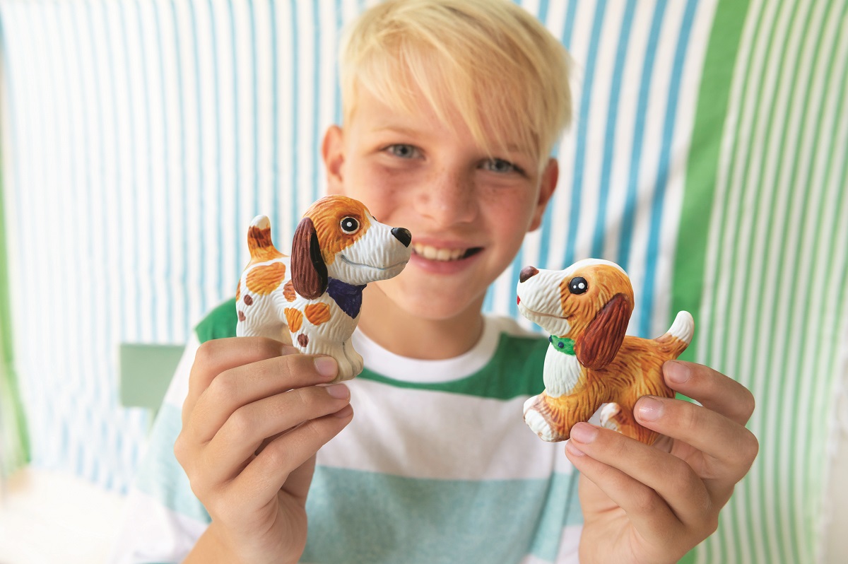 ΠΑΡΑΣΚΕΥΗ: Μόλις το μείγμα του γύψου στερεοποιηθεί στο καλούπι, τράβηξε τις δυο πλευρές του για να απελευθερώσεις τη φιγούρα του κουταβιού. Δώσε ζωή στον κουτάβι σου, χρησιμοποιώντας τους συνδυασμούς χρωμάτων της επιλογής σου. Αν χρειάζεσαι λίγη παραπάνω έμπνευση, μπορείς να συμβουλευτείς τη συσκευασία.