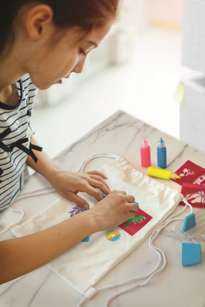 Φτιάξε τη δική σου τσάντα πλάτης με αυτό το εύκολο σετ για τέλεια σχέδια! Διακόσμησέ την με τα stencil και τα χρώματα που περιλαμβάνονται και φτιάξε μοναδικούς συνδυασμούς.