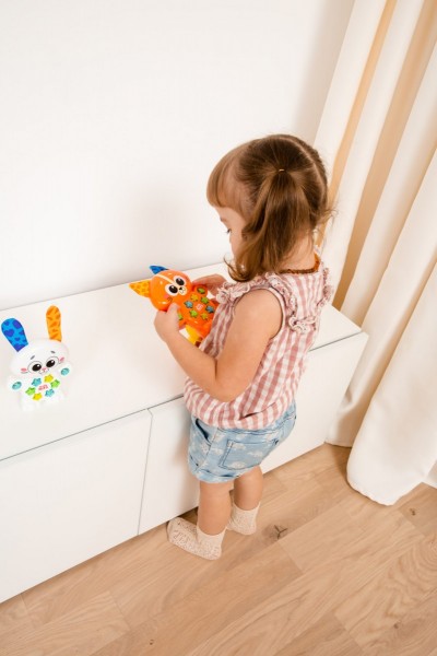 Με το Babies Μουσικό Ζωάκι Γατάκι το παιδί μαθαίνει στα ελληνικά την αλφάβητο και την αρίθμηση μέσα από διασκεδαστικές ασκήσεις. Οι αστείοι ήχοι και οι μελωδίες καλλιεργούν το ενδιαφέρον του για τη μουσική και το ενθαρρύνουν να τραγουδήσει και να χορέψει στο άκουσμα χαρούμενων τραγουδιών. Μια μεγάλη μουσική περιπέτεια ξεκινά! Διατίθεται σε τρία σχέδια: κουτάβι, γατάκι και λαγουδάκι.