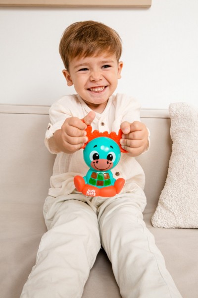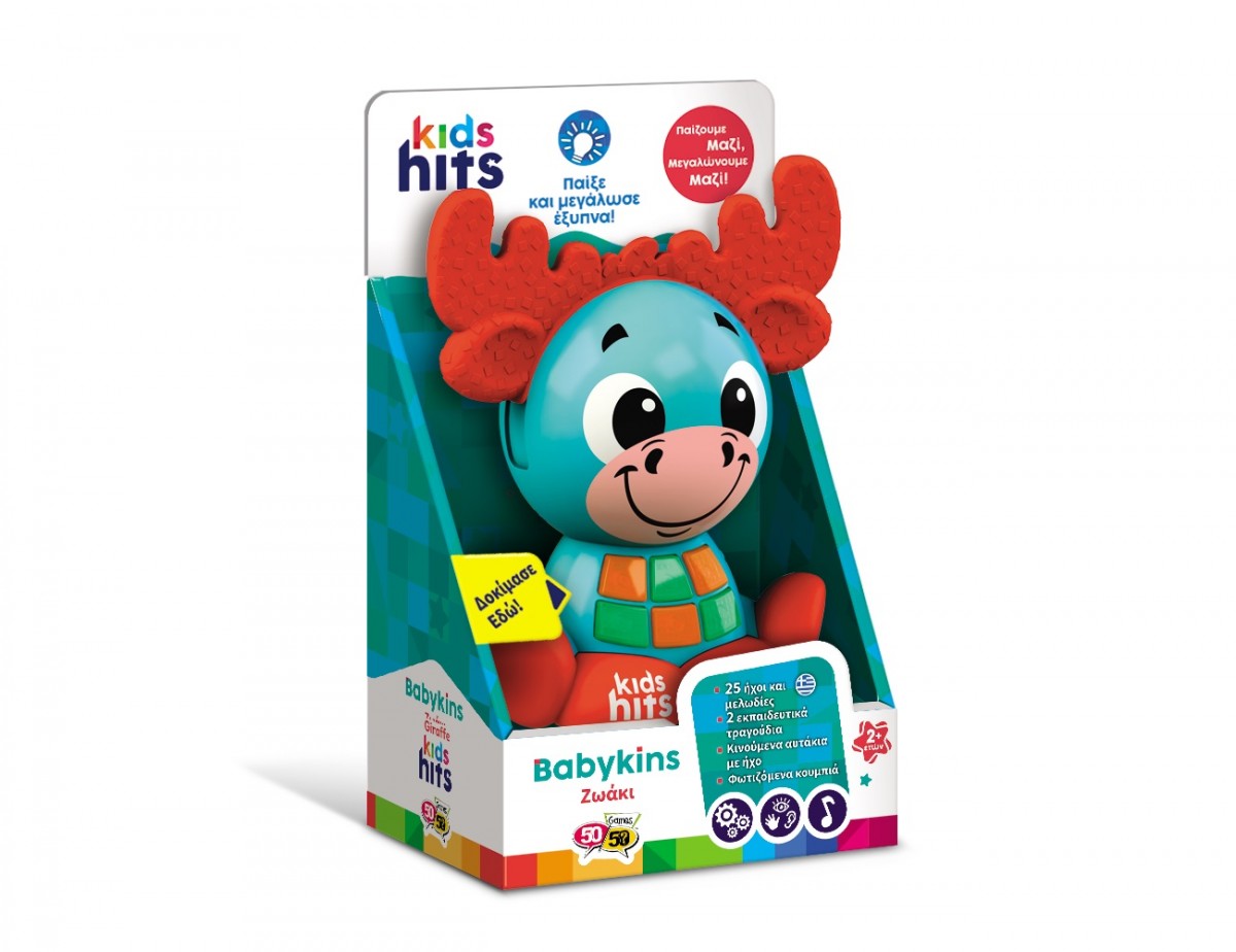 Το Babykins Ζωάκι Τάρανδος με τα χαρούμενα χρώματα και τους διασκεδαστικούς ήχους θα ενθουσιάσει κάθε παιδί! Τα ανάγλυφα κερατάκια του παιχνιδιού κινούνται κάνοντας κλικ. Πιέζοντας τα φωτεινά κουμπάκια, το παιδί επιλέγει να ακούσει τραγουδάκια στα Ελληνικά, χαρούμενες μελωδίες και αστείους ήχους. Τραγουδώντας την αλφάβητο και μαθαίνοντας αρίθμηση, κάθε μικρός φίλος θα διασκεδάσει αποκτώντας νέες γνώσεις! Διατίθεται σε τρία σχέδια: τάρανδος, καμηλοπάρδαλη και ζέβρα.