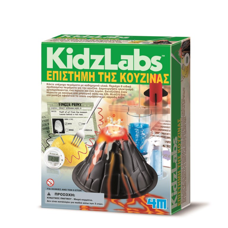 Κάνε τη κουζίνα το εργαστήριο σου! Πραγματοποίησε καταπληκτικά πειράματα με υλικά καθημερινής χρήσης από την κουζίνα σου. Μπορείς να παράγεις ηλεκτρισμό με την χρήση ενός πιρουνιού και ενός λεμονιού, να κατασκευάσεις κρυστάλλους με ζάχαρη, να εκτοξεύσεις έναν πύραυλο με ξύδι και άλλα διασκεδαστικά πειράματα. Διάβασε τα ψυχαγωγικά στοιχεία που περιλαμβάνονται στις οδηγίες και μάθε διασκεδαστικές πληροφορίες για τους πυραύλους, τα ηφαίστεια, τους κρυστάλλους, τα αποτυπώματα και τις μπαταρίες.