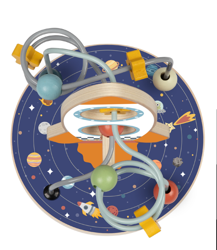 Ο διαστημικός λαβύρινθος σε σχήμα πυραύλου με χάντρες έχει σταθερή βαση που μπορεί να τοποθετηθεί με ασφάλεια σε επίπεδη επιφάνεια. Είναι κατασκευασμένος από ξύλο για ανθεκτική και ασφαλή χρήση.