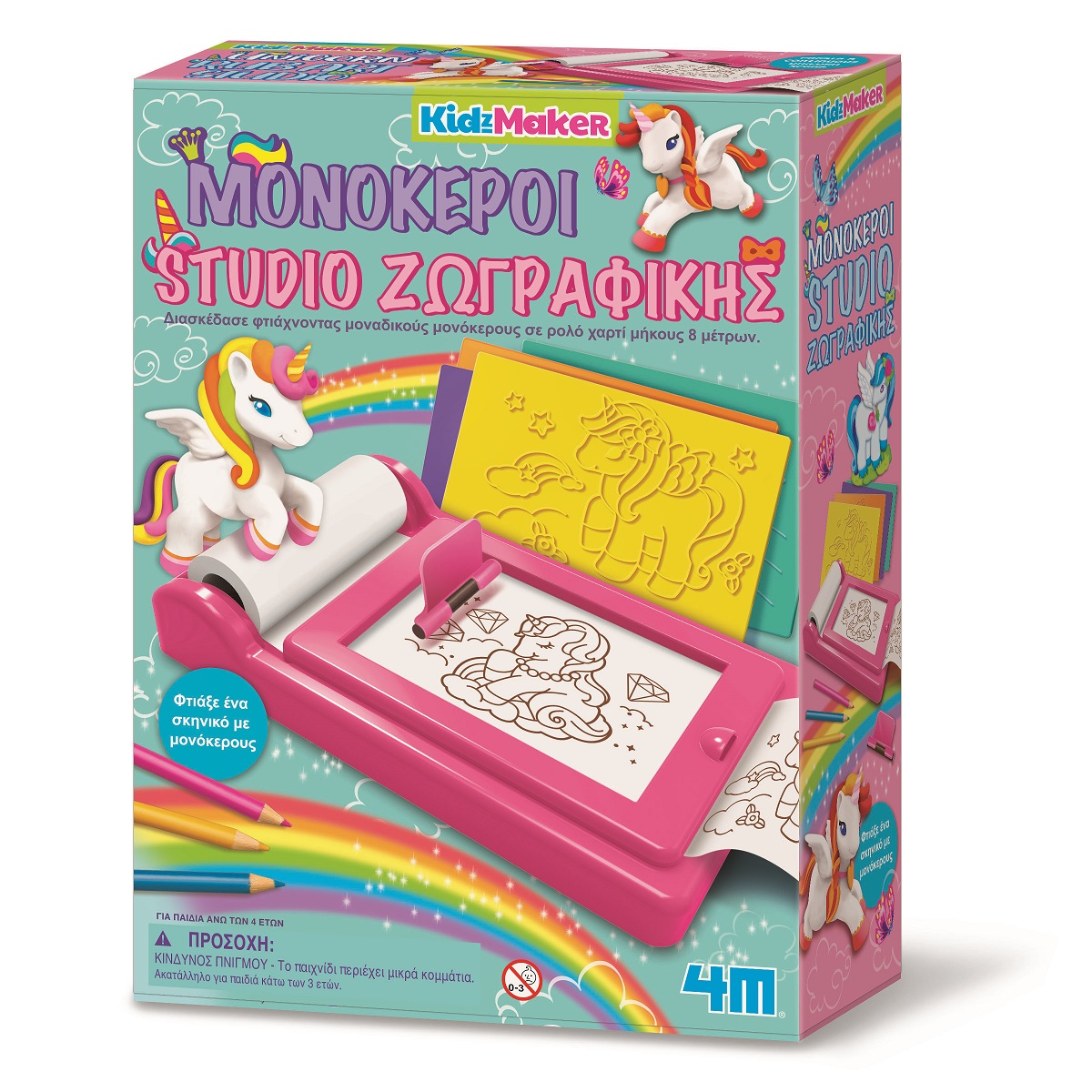 ΠΕΡΙΕΧΟΜΕΝΑ: 1 studio ζωγραφικής, 4 πρότυπα με σχέδια μονόκερου, 1 θήκη για κηρομπογιές, 1 τσάντα αποθήκευσης, 1 ρολό χαρτί (8 μέτρα μήκος), 2 κηρομπογιές, 3 χρωματιστά μολύβια.