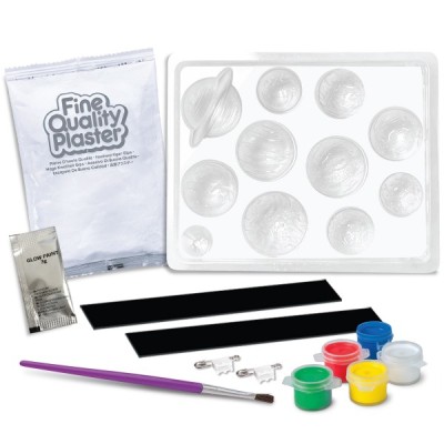 ΠΑΡΑΣΚΕΥΗ: Προετοίμασε τον γύψο ακολουθώντας τις οδηγίες και ρίξε το μείγμα στο καλούπι. Περίμενε λίγο μέχρι να σταθεροποιηθεί και έπειτα αφαίρεσέ τον και χρωμάτισε τους πλανήτες με τα χρώματα που περιλαμβάνονται. Άφησε τα να στεγνώσουν εντελώς. Έπειτα κόλλησε στην πίσω επίπεδη πλευρά τους μαγνήτες ή τις ειδικές καρφίτσες και δημιούργησε έτσι τους τέλειους μαγνήτες για το ψυγείο σου ή κονκάρδες για τα ρούχα και την τσάντα σου.