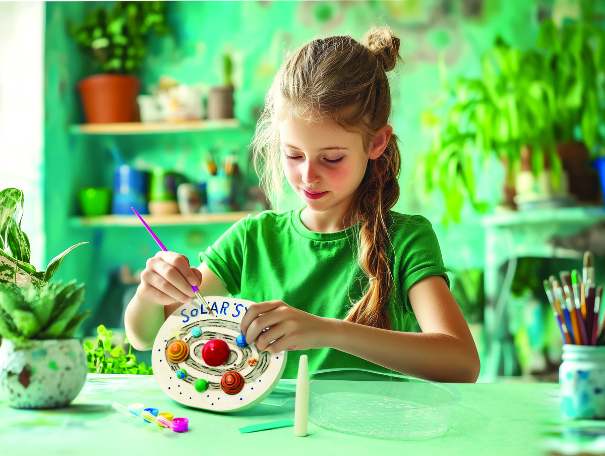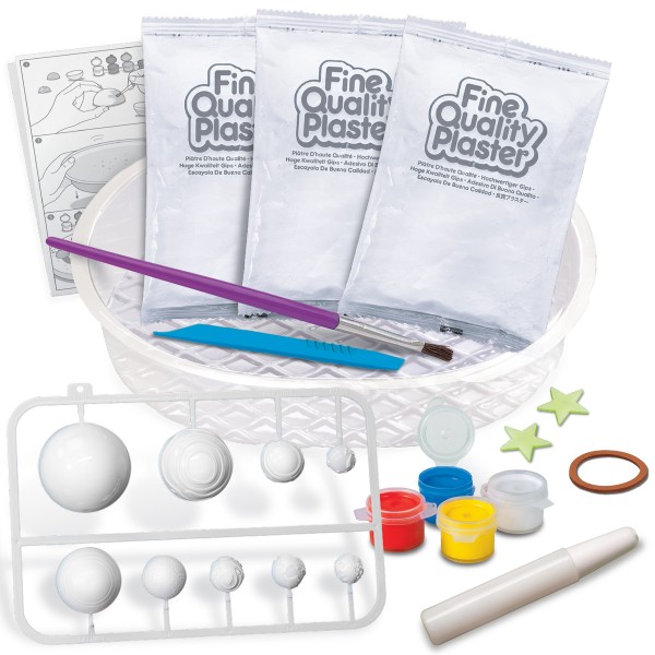 Περιεχόμενα: σκόνη σε γύψο, δίσκος διαμόρφωση και ανάμειξης, πινέλο, παλέτα χρωμάτων, καλούπι πλανήτη, φωσφορίζον αστέρι, εργαλείο σκαλίσματος, βαφή επίστρωσης.