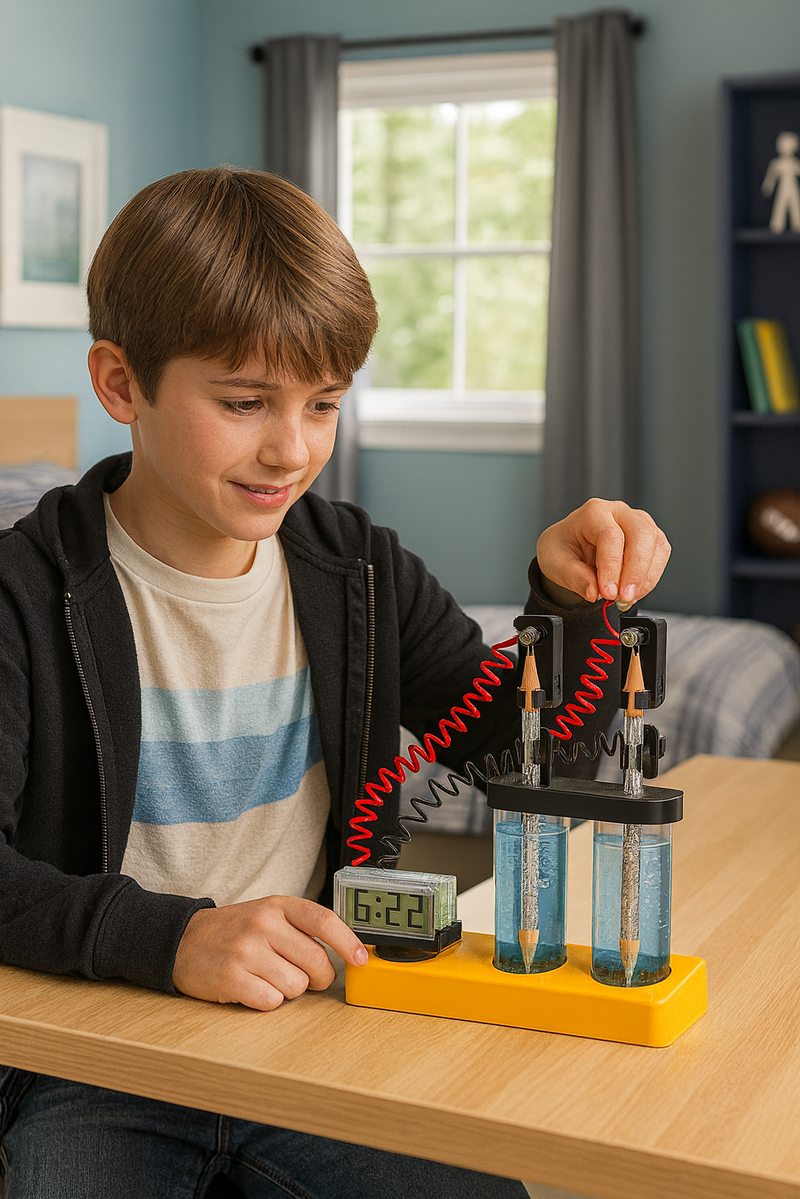 Φτιάξε το δικό σου Επιστημονικό Ρολόι και δες την επιστήμη να ζωντανεύει μπροστά σου! Με απλά υλικά από την κουζίνα – όπως αλατόνερο, αλουμινόχαρτο και μολύβια – θα δημιουργήσεις ηλεκτρική ενέργεια που θα τροφοδοτήσει ένα πραγματικό ψηφιακό ρολόι.