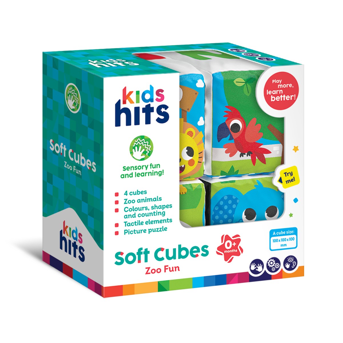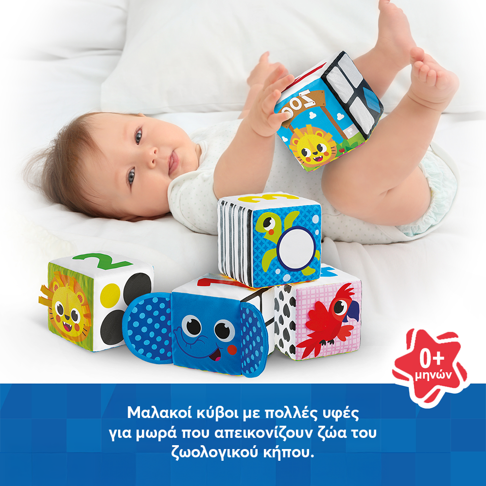 Οι Μαλακοί Κύβοι Ζωολογικός Κήπος θα ενθουσιάσουν όλους τους μικρούς φίλους! Οι κύβοι περιλαμβάνουν ευχάριστες στην αφή λεπτομέρειες, όπως καθρεφτάκι και κορδέλες, οι οποίες προσφέρουν ποικίλα αισθητηριακά ερεθίσματα. Κάθε πλευρά του κύβου περιλαμβάνει και μια διαφορετική πληροφορία. Τα μωρά μπορούν να φτιάξουν παζλ με τους κύβους συνδυάζοντάς τους κατάλληλα, να τους στοιβάξουν, να μάθουν αρίθμηση, χρώματα και σχήματα.