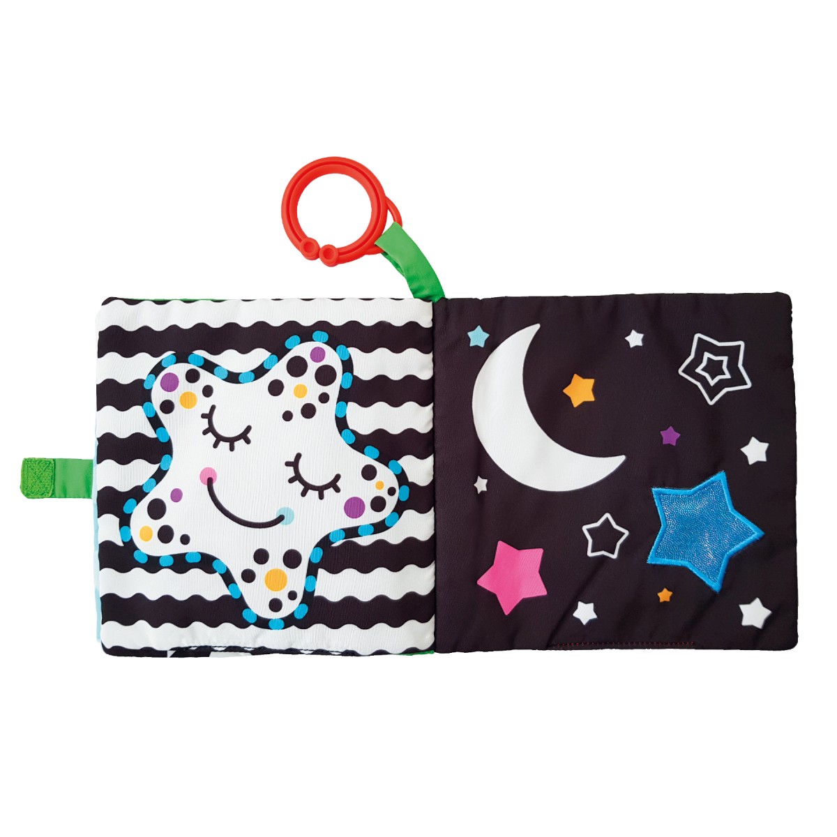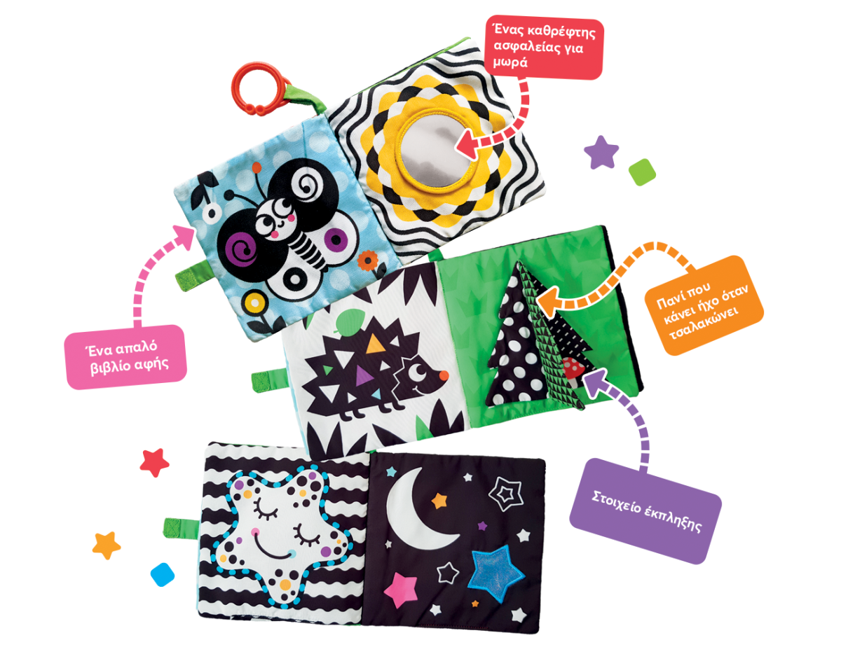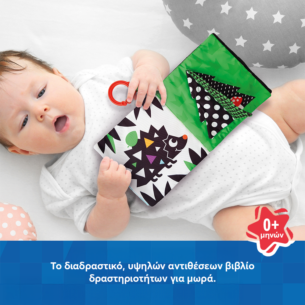Αυτό το παιχνίδι υψηλής αντίθεσης είναι ιδανικό για τη διασκέδαση και την ανάπτυξη των νεογέννητων! Το διαδραστικό υφασμάτινο βιβλίο δραστηριοτήτων περιλαμβάνει σελίδες που μπορούν να πιαστούν, να ξεφυλλιστούν και να ανακαλυφθούν, με κρυμμένες εκπλήξεις, ένα «θροΐζον» πτερύγιο (crinkle flap) που κάνει ήχο, και έναν ασφαλή καθρέφτη που ενισχύει την ανακάλυψη του εαυτού τους. Χάρη στον κρίκο ανάρτησης, το παιχνίδι μπορεί να τοποθετηθεί εύκολα σε κούνια ή καρότσι για ατελείωτη διασκέδαση όπου κι αν βρίσκεστε!