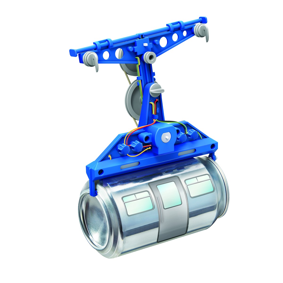 ΤΡΟΠΟΣ ΛΕΙΤΟΥΡΓΙΑΣ: Οι μπαταρίες παρέχουν ηλεκτρισμό στο κινητήρα που γυρίζει την τροχαλία με γρήγορη ταχύτητα. Οι τροχαλίες μειώνουν την ταχύτητα της περιστροφής, έτσι ώστε η ρόδα στην κορυφή να γυρίζει αρκετά αργά. Αυτή η ρόδα λειτουργεί ως τροχός τροφοδοσίας, καθώς τραβάει το σπάγκο, ο οποίος στη συνέχει τραβάει τραβάει το τελεφερίκ κατά μήκος του. Η τριβή που δημιουργείται ανάμεσα στο σπάγκο και στον τροχό τροφοδοσίας εμποδίζει το τελεφερίκ να γλιστρήσει. Ο διακόπτης αντιστροφής αλλάζει την κατεύθυνση που περνάει το ρεύμα μέσα στο μοτέρ. Όταν ο διακόπτης είναι σε λειτουργία, κάνει το μοτέρ να γυρίζει προς την αντίθετη κατεύθυνση. Όταν το εναέριο τελεφερίκ φτάνει στο στοπ στην άκρη του καλωδίου, ο αντιστρεφόμενος άξονας πιέζεται, θέτοντας σε λειτουργία τον διακόπτη αναστροφής, κάνοντας το εναέριο τελεφερίκ να ξεκινήσει και πάλι.