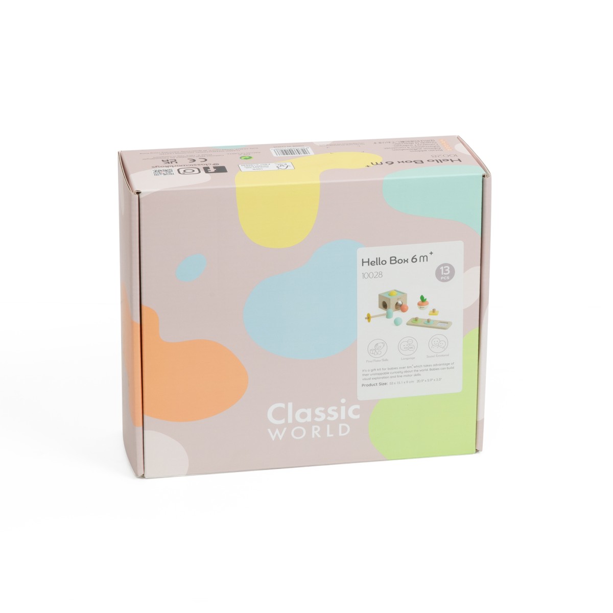 Το Hello Box είναι ένα σετ δώρου κατάλληλο για μωρά άνω των 6 μηνών, το οποίο αξιοποιεί την αστείρευτη περιέργειά τους για τον κόσμο γύρω τους. Μέσα από το παιχνίδι, τα μωρά ενισχύουν την οπτική εξερεύνηση και αναπτύσσουν τις λεπτές κινητικές τους δεξιότητες. Ιδανικό για τα πρώτα στάδια της ανάπτυξης, προσφέρει ασφαλείς και διασκεδαστικές δραστηριότητες που διεγείρουν τις αισθήσεις και ενθαρρύνουν την ανακάλυψη