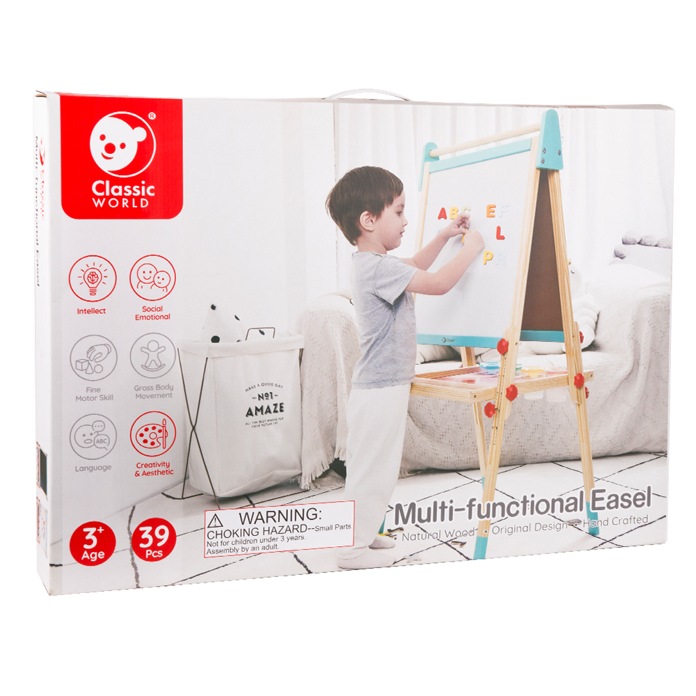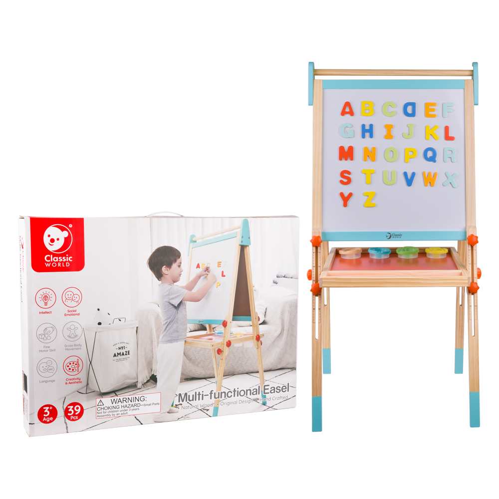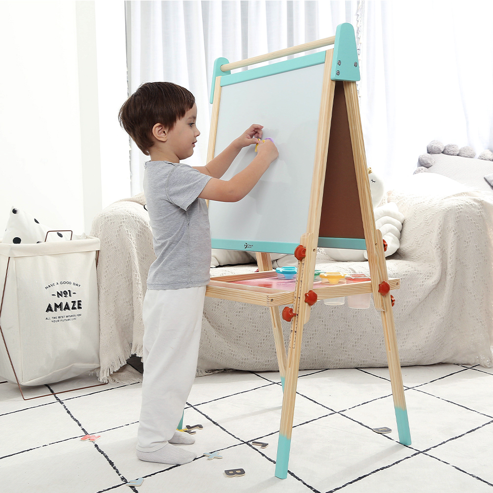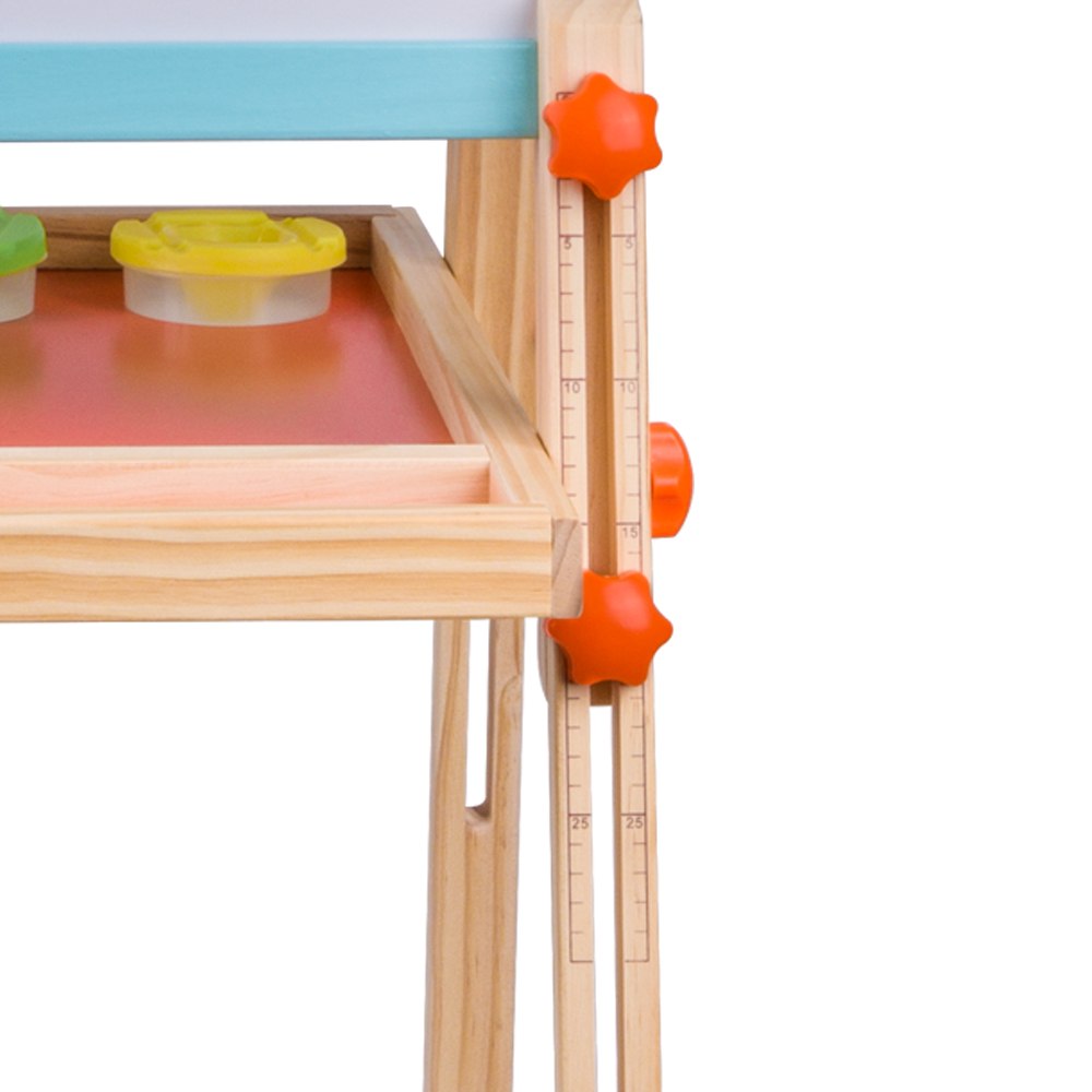 Αυτός ο ξύλινος μαγνητικός πίνακας διαθέτει μαυροπίνακα και μαγνητικό λευκό πίνακα, ιδανικούς για να δημιουργούν τα παιδιά όμορφες ζωγραφιές. Στα πλαϊνά του έχει διαβαθμισμένη κλίμακα για εύκολη ρύθμιση ύψους, ώστε να προσαρμόζεται ανάλογα με την ηλικία. Συμπεριλαμβάνονται πλαστικά ποτηράκια για χρώματα και μαγνητικά αγγλικά γράμματα. Ένα υπέροχο εργαλείο για να μάθουν τα παιδιά αγγλικά και να αναπτύξουν τη δημιουργικότητά τους!
