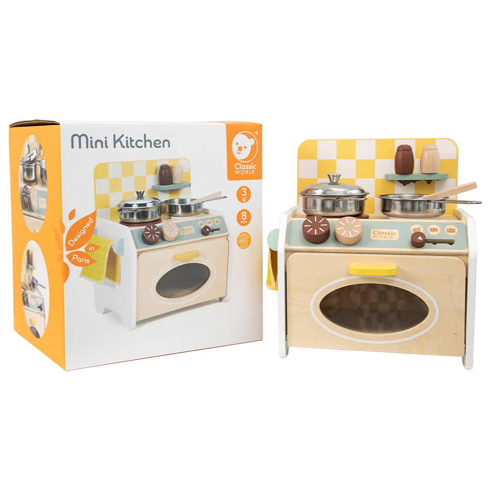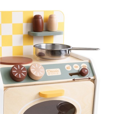 Αυτή η ξύλινη κουζίνα μικρού μεγέθους είναι ένα παιχνίδι φαντασίας που θα βρει εύκολα τη θέση της στο σπίτι. Ο συνδυασμός φυσικού και σκούρου ξύλου με το λευκό δίνει μια διακοσμητική και φρέσκια εμφάνιση, που ταιριάζει αρμονικά σε μοντέρνους χώρους. Η μικρή μας κουζίνα είναι πραγματικά πλήρης με τις δύο εστίες και τον φούρνο της. Τα χειριστήρια είναι διασκεδαστικά στη χρήση, ενώ τα αξεσουάρ (τηγάνι, κατσαρόλα, αλάτι και πιπέρι) επιτρέπουν στα παιδιά να μαγειρέψουν νόστιμα πιάτα.