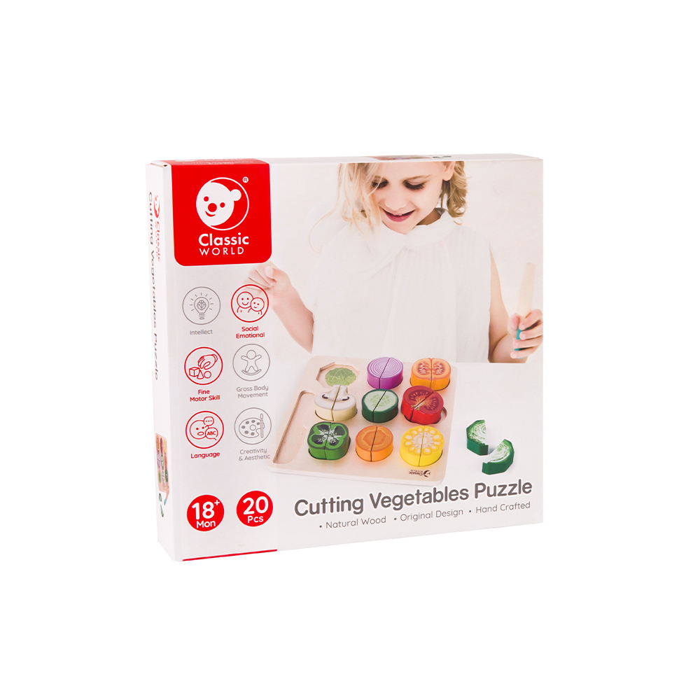 Ας διασκεδάσουμε μαθαίνοντας για τα σχήματα και τα χρώματα των λαχανικών, μέσα και έξω, με αυτό το πολύχρωμο παζλ και ξύλο κοπής! Τα λαχανικά μπορούν να κοπούν από τη μία πλευρά της ξύλινης επιφάνειας κοπής και να ταιριάξουν με την ολοκληρωμένη εικόνα τους από την άλλη πλευρά. Είναι η καλύτερη υγιεινή επιλογή για την εκπαίδευση της συνεργασίας χεριού-ματιού και της ευκαμψίας των χεριών των μικρών παιδιών.
