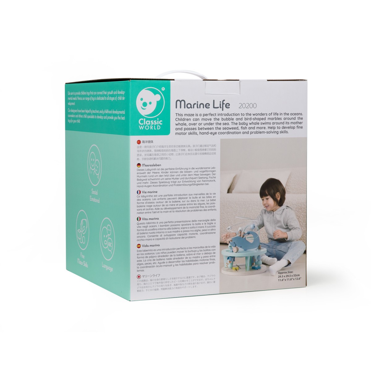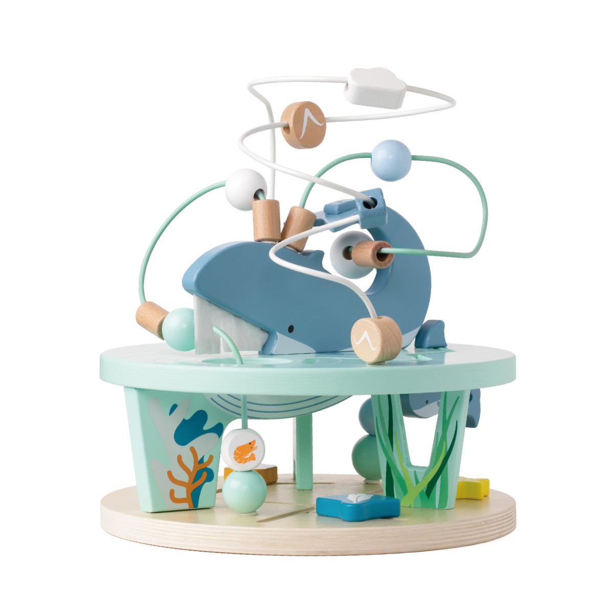 Αυτός ο υπέροχος Ξύλινος Λαβύρινθος αποτελεί έναν ιδανικό τρόπο για να προσεγγίσουν τα παιδιά τον μαγικό κόσμο της ζωής στους ωκεανούς. Τα παιδιά μπορούν να μετακινούν τις πολύχρωμες στρογγυλές χάντρες με διάφορα σχέδια γύρω από τη φάλαινα, πάνω και κάτω από τη θάλασσα, ακολουθώντας το μικρό φαλαινάκι καθώς κολυμπά γύρω από τη μαμά του και περνά ανάμεσα από φύκια, ψάρια και άλλα θαλάσσια στοιχεία. Το παιχνίδι βοηθά στην ανάπτυξη της λεπτής κινητικότητας, του συντονισμού χεριού-ματιού και της ικανότητας επίλυσης προβλημάτων, προσφέροντας ταυτόχρονα ώρες δημιουργικής και διασκεδαστικής απασχόλησης.