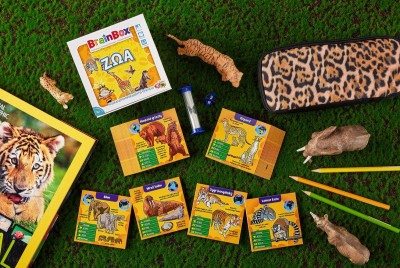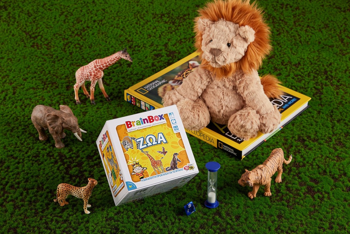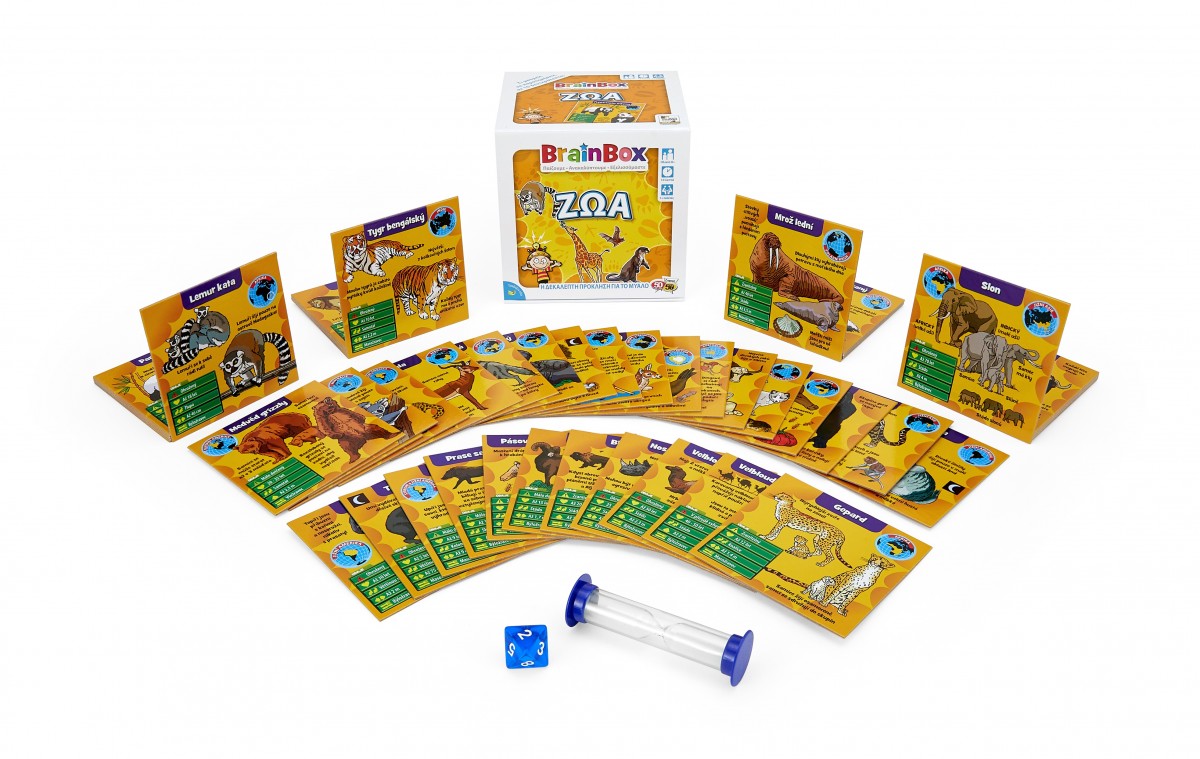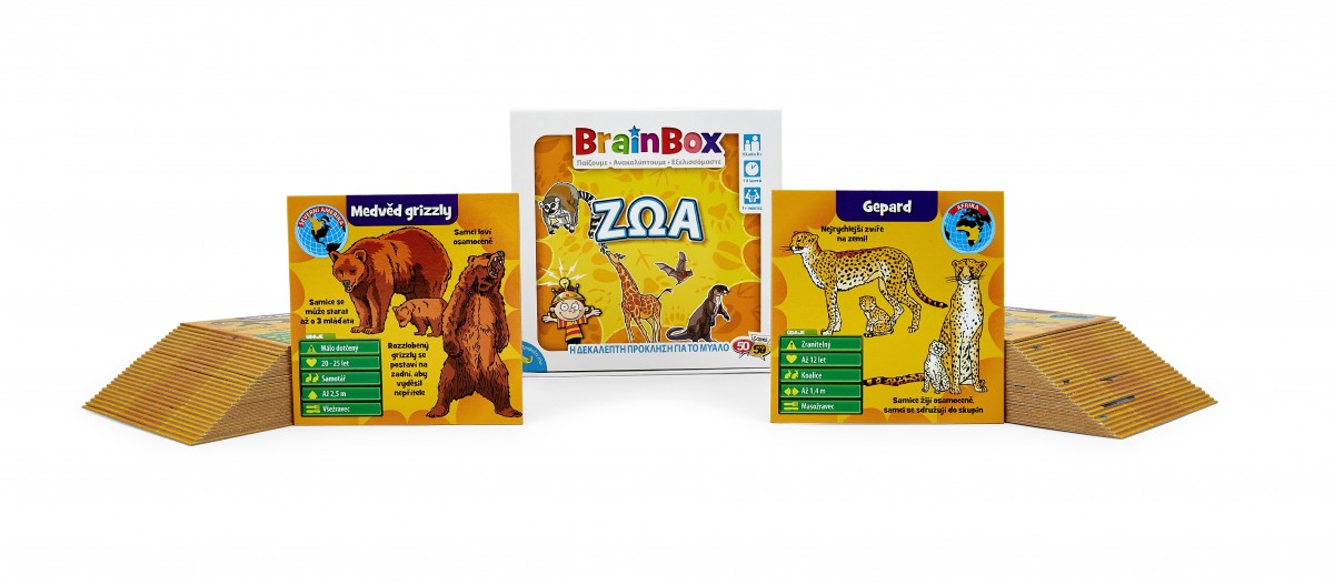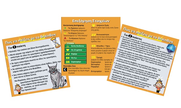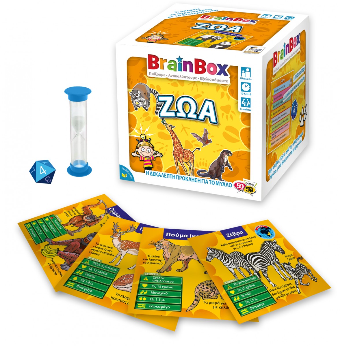 Εξερεύνησε το ζωικό βασίλειο με τον πιο διασκεδαστικό τρόπο! Διάλεξε μια κάρτα μέσα από το BrainBox. Αναποδογύρισε την κλεψύδρα και προσπάθησε να τη μάθεις απ'έξω μέσα σε 10 δευτερόλεπτα! Τώρα ρίξε το ζάρι και απάντα στην αντίστοιχη ερώτηση. Αν απαντήσεις σωστά κρατάς την κάρτα, αν απαντήσεις λάθος βάζεις την κάρτα και πάλι μέσα στο BrainBox.