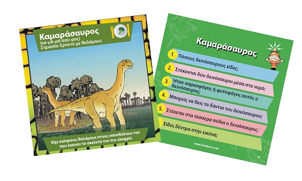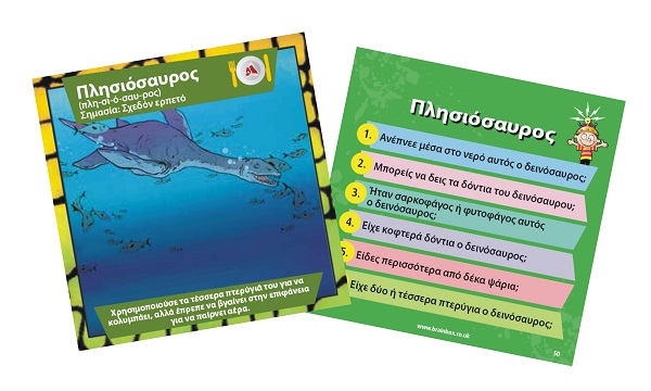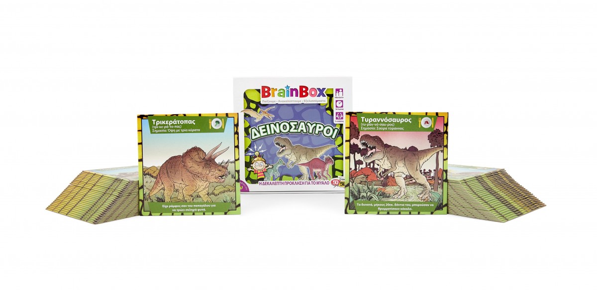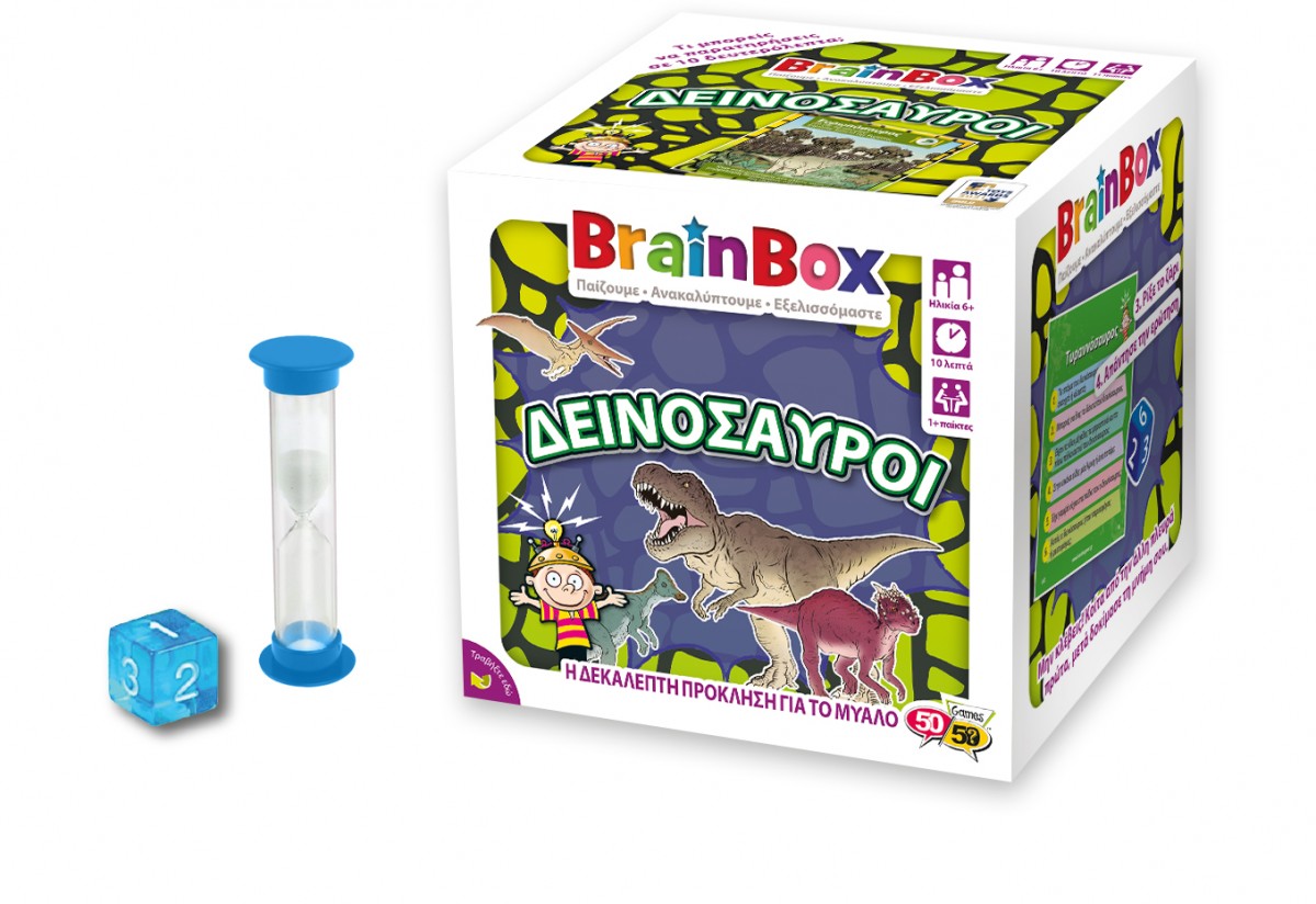 Ανακάλυψε τον κόσμο των δεινοσαύρων! Διάλεξε μία κάρτα μέσα από το BrainBox. Αναποδογύρισε την κλεψύδρα και προσπάθησε να τη μάθεις απ'έξω σε 10 δευτερόλεπτα! Τώρα ρίξε το ζάρι και απάντα στην αντίστοιχη ερώτηση. Αν απαντήσεις σωστά κρατάς την κάρτα, αν απαντήσεις λάθος βάζεις την κάρτα και πάλι μέσα στο BrainBox.