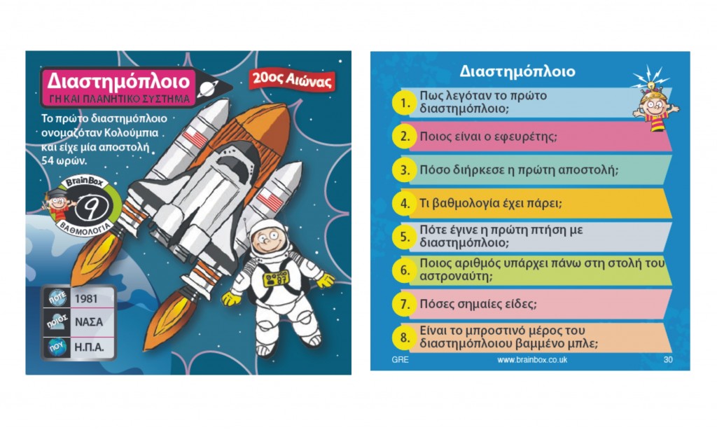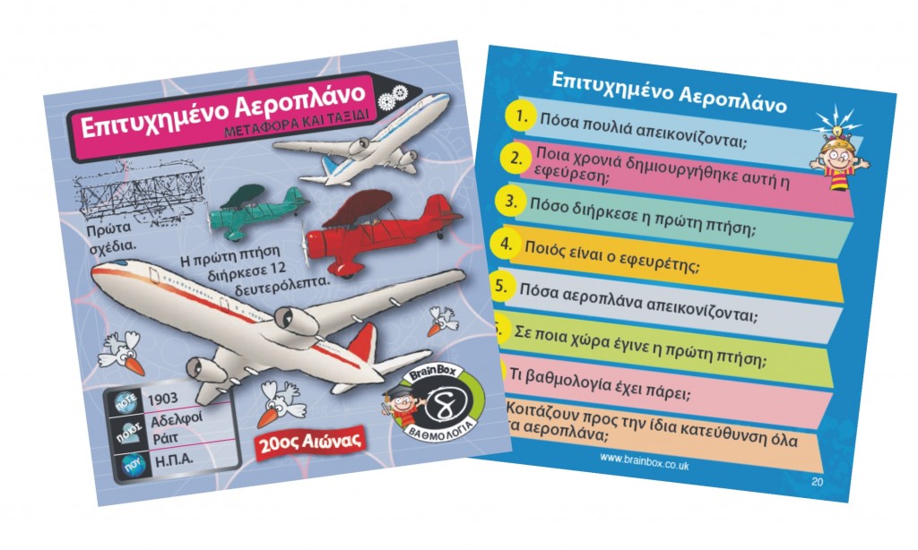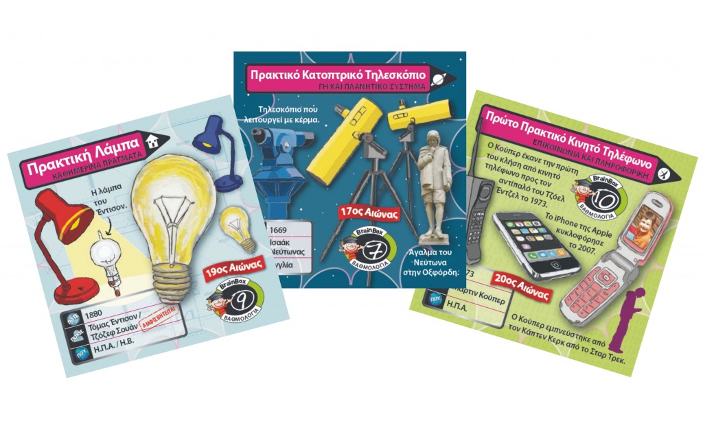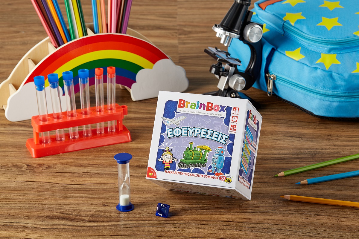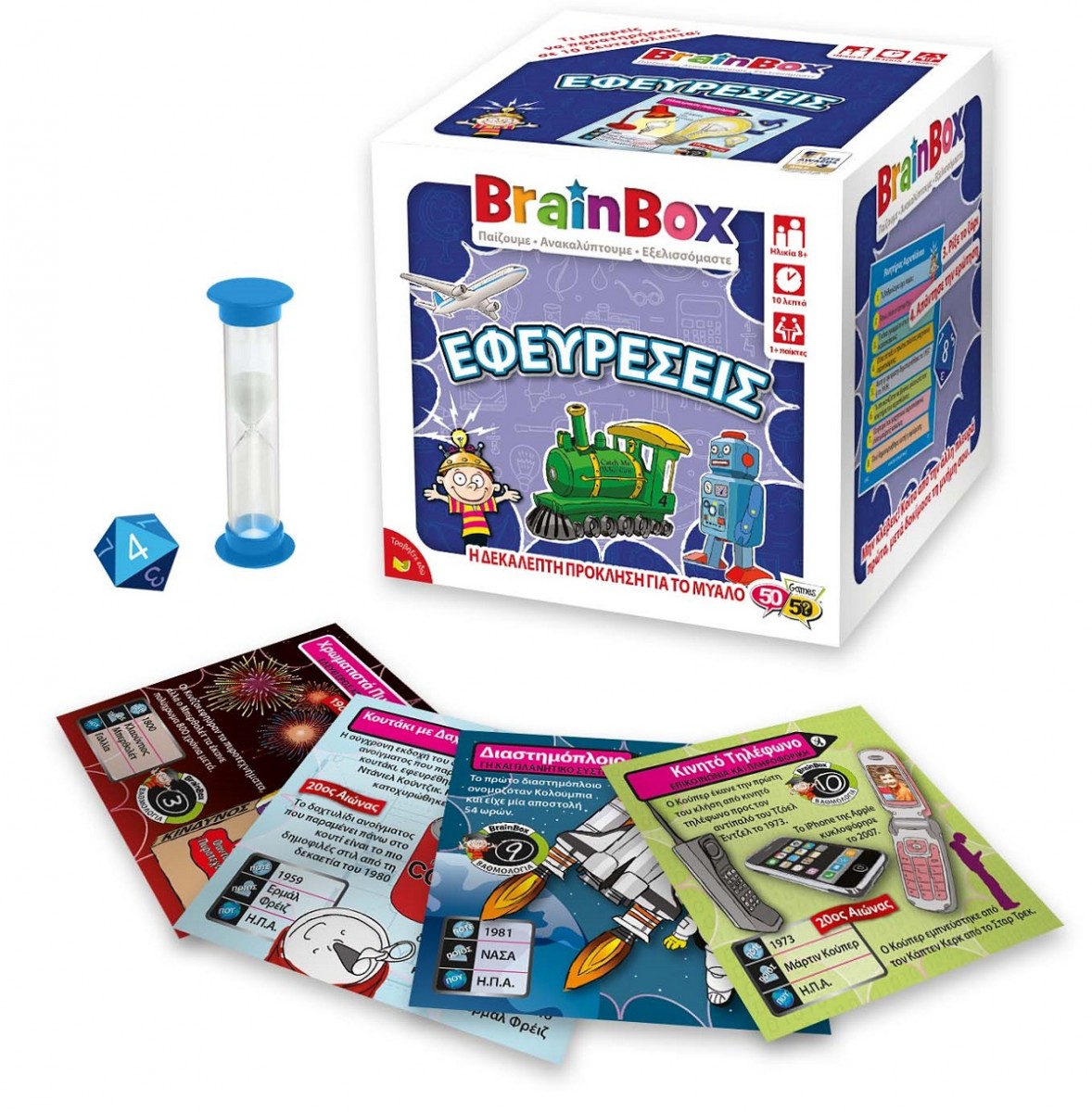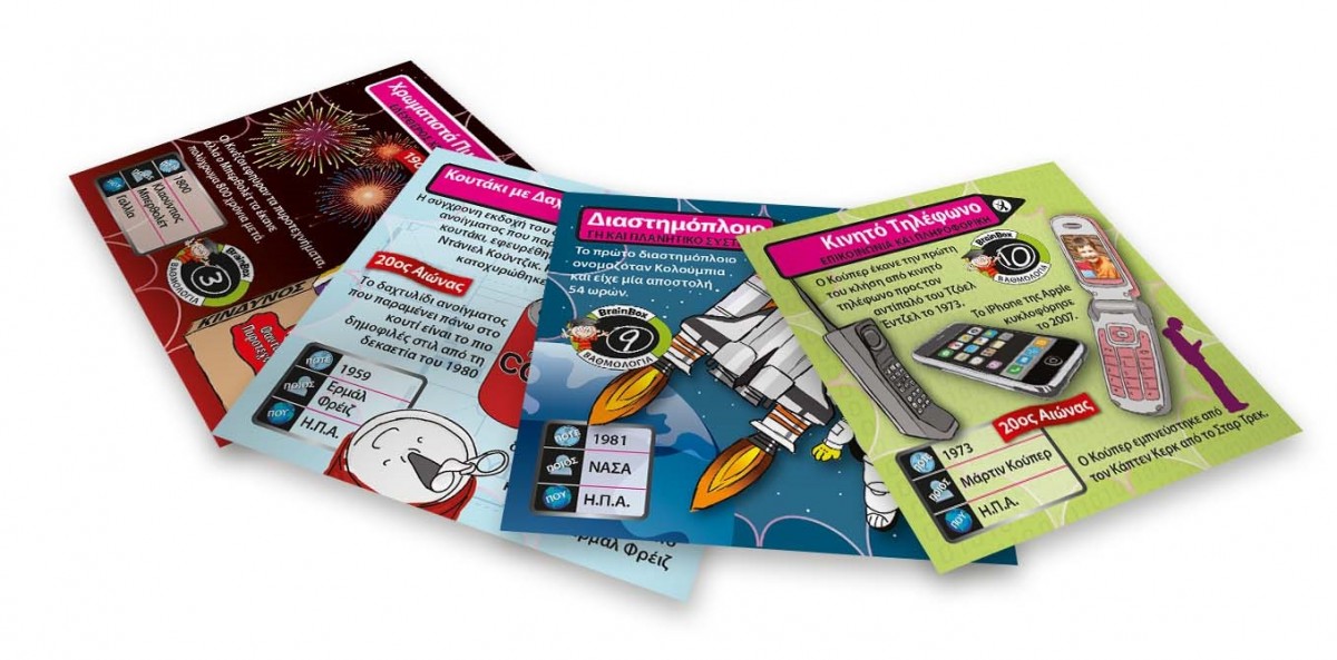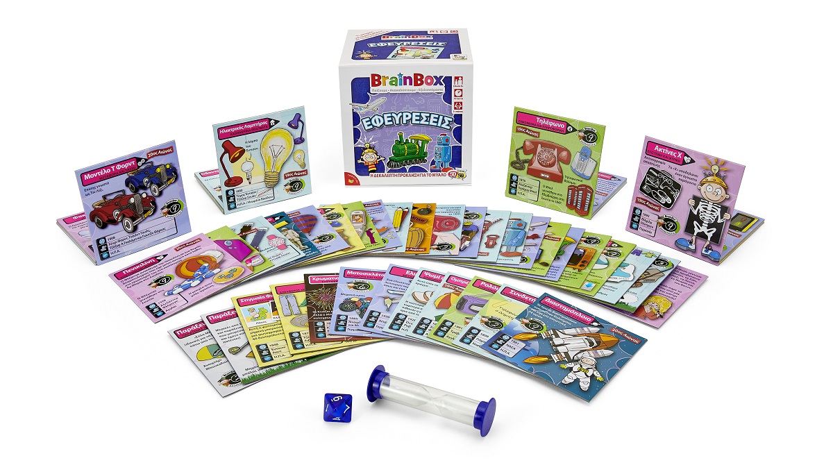 Γνώρισε τις πιο σημαντικές ή και παράξενες εφευρέσεις! Διάλεξε μια κάρτα μέσα από το BrainBox. Αναποδογύρισε την κλεψύδρα και προσπάθησε να μάθεις απ'έξω την κάρτα σε 10 δευτερόλεπτα! Τώρα ρίξε το ζάρι και απάντησε στην αντίστοιχη ερώτηση. Αν απαντήσεις σωστά κρατάς την κάρτα, αν απαντήσεις λάθος βάζεις την κάρτα πάλι μέσα στο BrainBox.