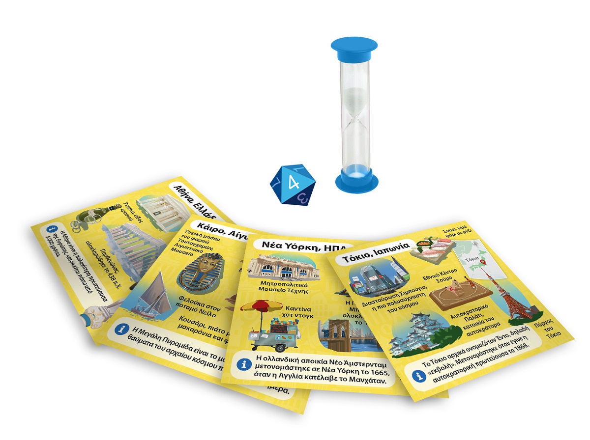 Ταξίδεψε στις πιο εντυπωσιακές πόλεις του κόσμου! Διάλεξε μια κάρτα μέσα από το BrainBox. Αναποδογύρισε την κλεψύδρα και προσπάθησε να μάθεις απ'έξω την κάρτα σε 10 δευτερόλεπτα! Τώρα ρίξε το ζάρι και απάντησε στην αντίστοιχη ερώτηση. Αν απαντήσεις σωστά κρατάς την κάρτα, αν απαντήσεις λάθος βάζεις την κάρτα πάλι μέσα στο BrainBox.